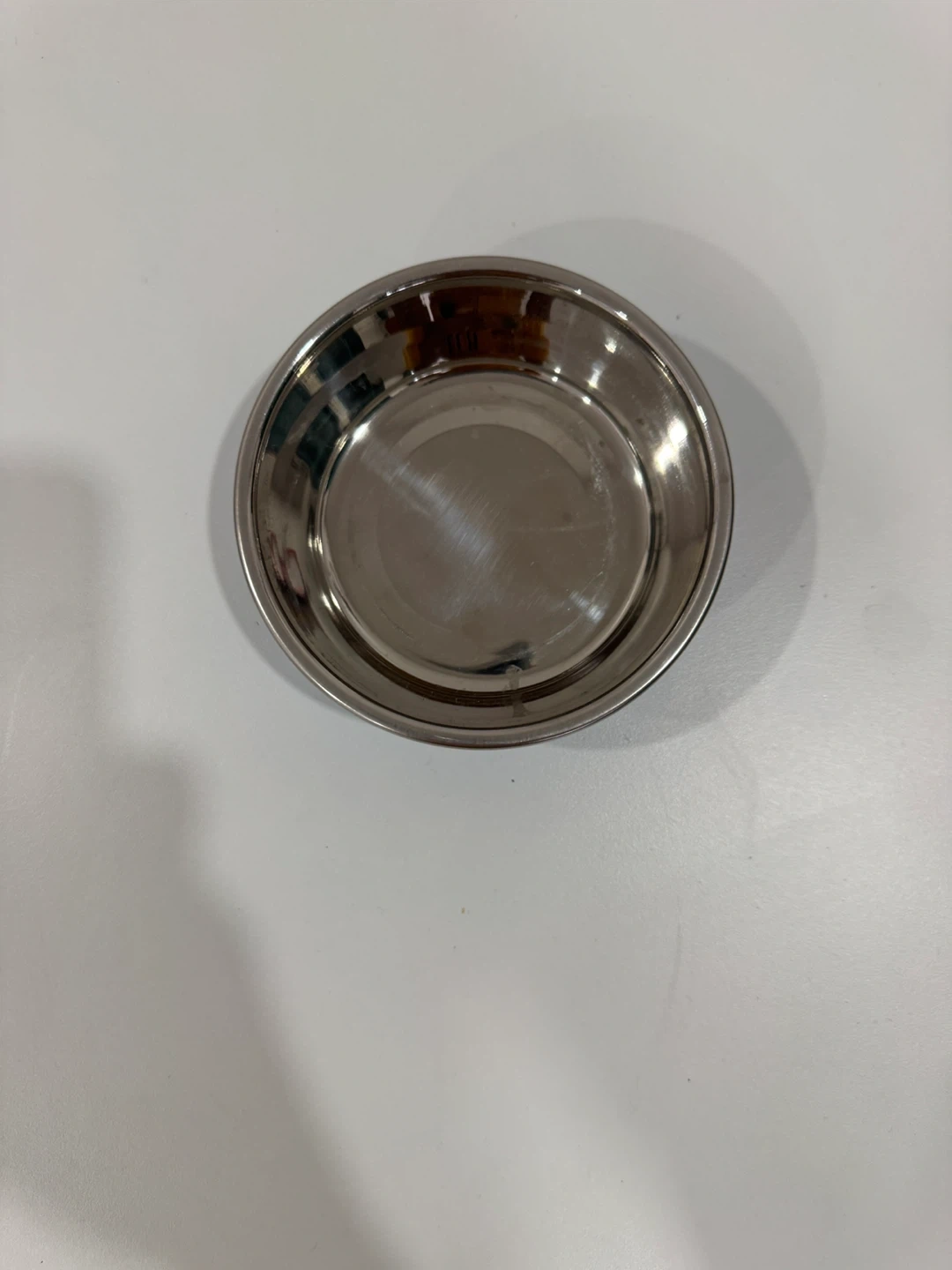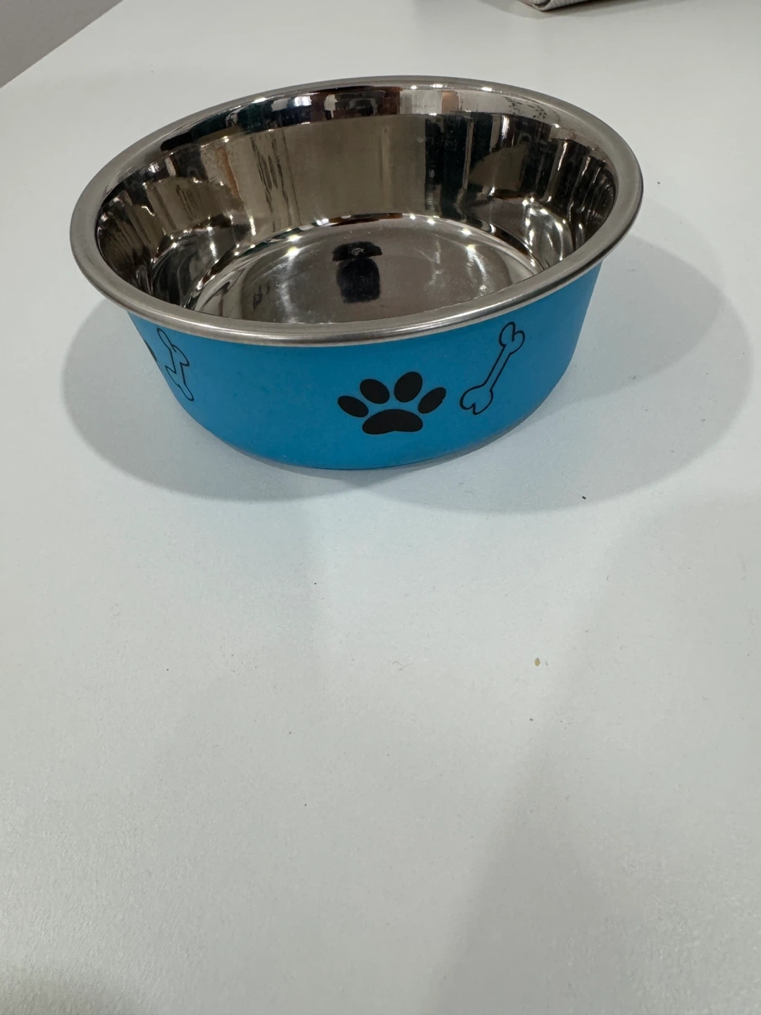 I'm selling a stainless steel dog food bowl. It has a blue exterior with paw prints and bone designs. It is brand new never used. It has a non-slip rubber base as well.