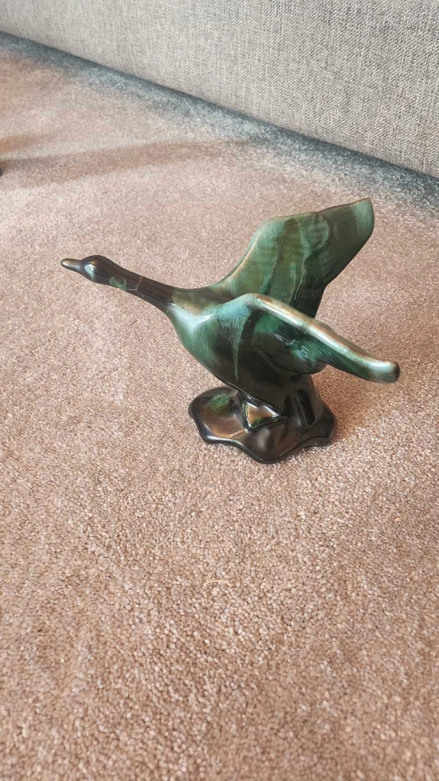 Add a touch of Canadian artistry to your home with this vintage Blue Mountain Pottery flying goose figurine, featuring a distinctive green and black glaze, perfect for collectors and admirers of unique decor. Please note the crack in the neck as highlighted in the pictures; it is in used condition. It's still a very beautiful piece. If the ad is still posted, then yes, it's still available!