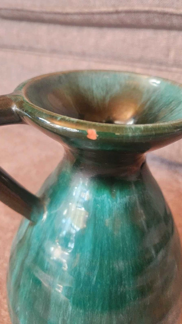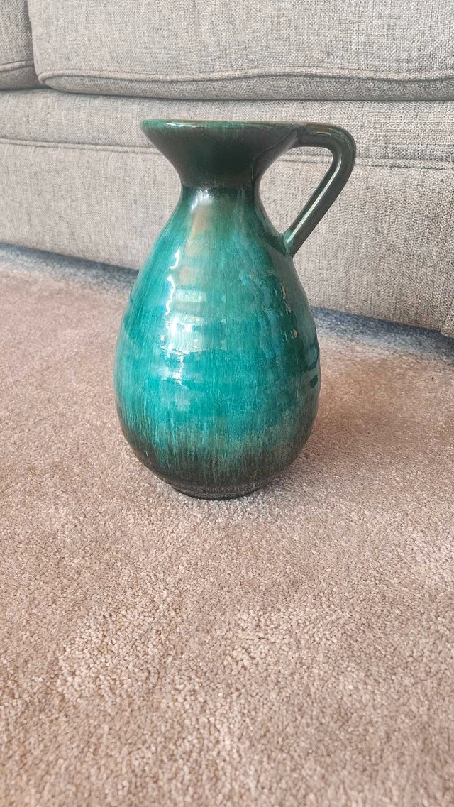 0Add a touch of vintage charm to your home with this eye-catching teal ceramic pitcher, featuring a glossy finish and a comfortable handle for easy pouring. This pitcher is in used condition, with a small chip near the top, as shown in the photos. It is approximately 9 inches tall and 5 inches wide. This beautiful pitcher would be perfect for serving water or juice, or simply as a decorative piece. Smoke free home * Colour: Teal * Material: Ceramic * Height: Approximately 9 inches * Width: Approximately 5 inches I have priced it accordingly, considering the small chip. Don't miss out on the chance to own this lovely piece! And just a little note: if you're seeing this ad, then yes, it's still available!