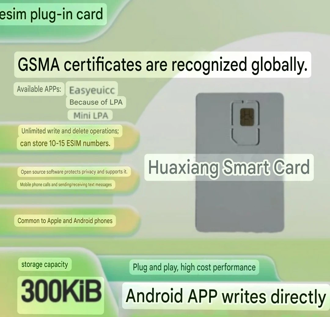 eSIM sim card. It's compatible with both Apple and Android phones. It supports unlimited write and delete operations and can store 10-15 eSIM numbers. It uses open source software to protect privacy and supports it. White 300K storage 25$ each。
