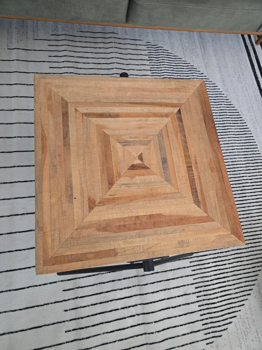 Selling a square coffee table with a unique wood design on top. The legs are black metal. It's in great shape and would look lovely in any living room!
