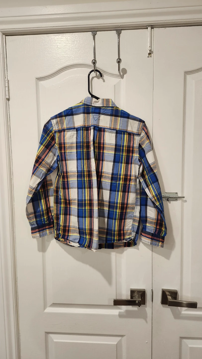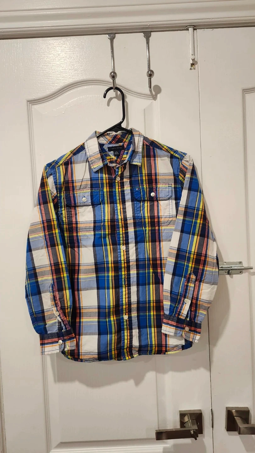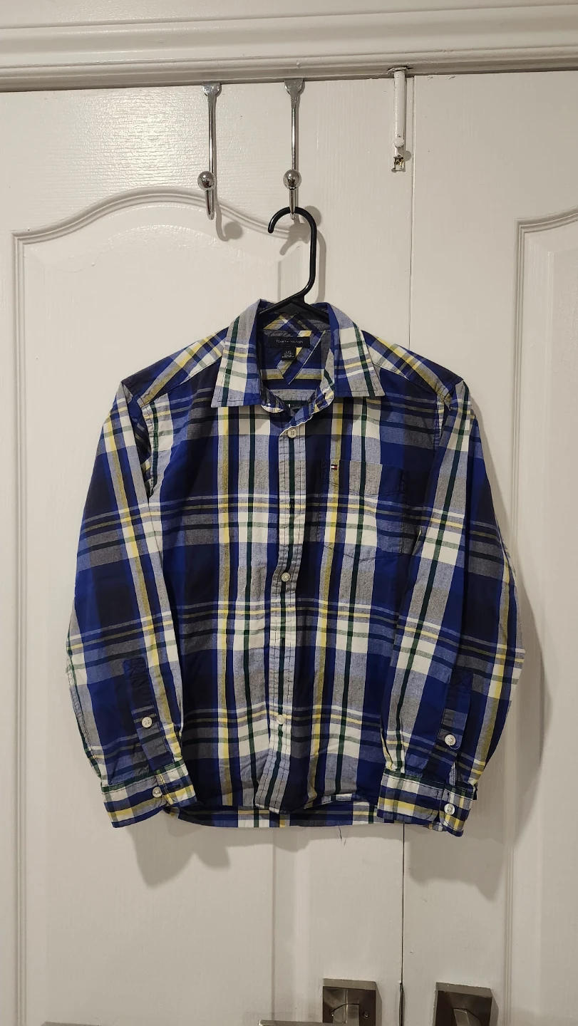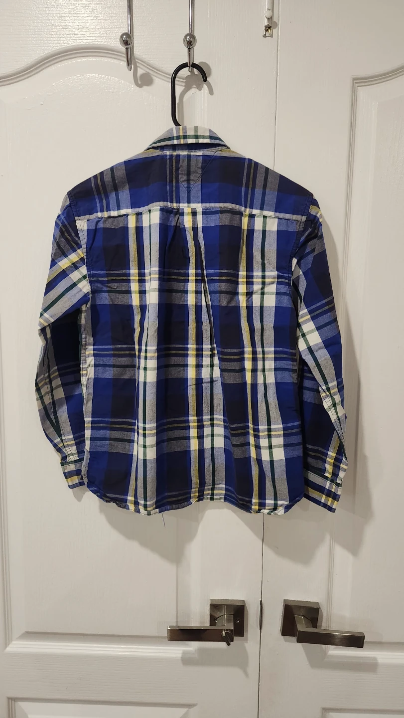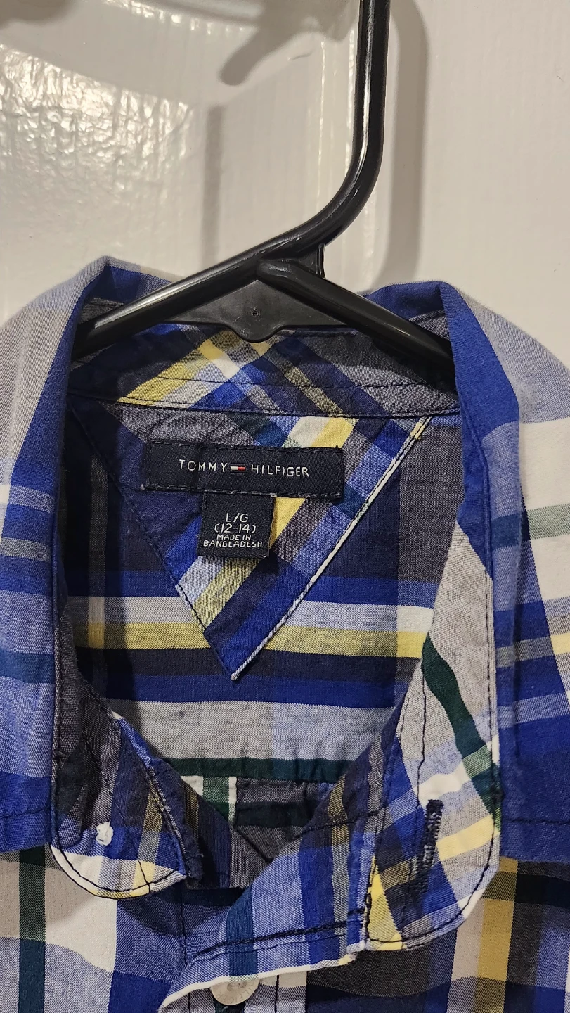 Set of 2 hardly used Tommy Hilfiger plaid shirt in size L (12-14) for kids. It's in great condition and ready for a new home! The shirt features a classic plaid pattern with a mix of blue, yellow, and white colours. Perfect for casual wear or dressing up a bit. Perfect for 10-12 yr old boys. Both for $6.