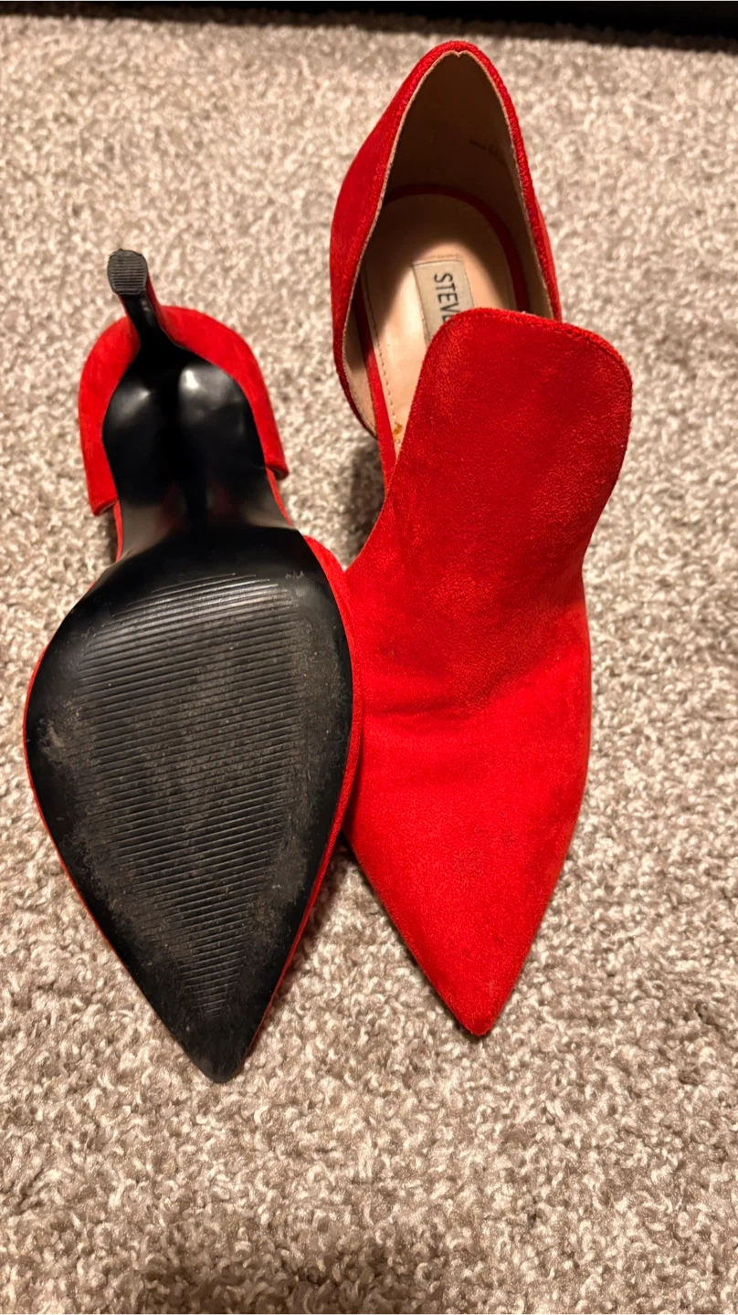 Selling a pair of Steve Madden heels in a vibrant red colour! They are a women's size 8.5/39 Perfect for adding a pop of colour to any outfit.