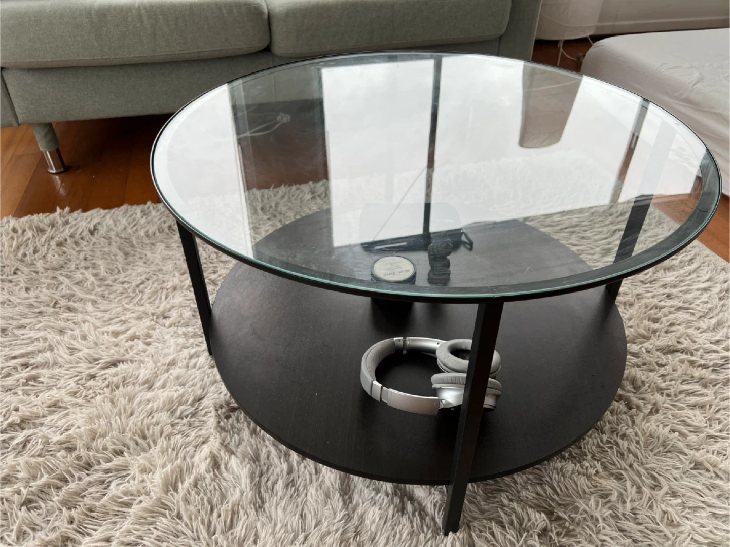 Selling a VITTSJÖ coffee table from IKEA! It features a sleek black metal frame with a glass top. The table also has a lower shelf for storage or decor. Great for any living room or seating area!