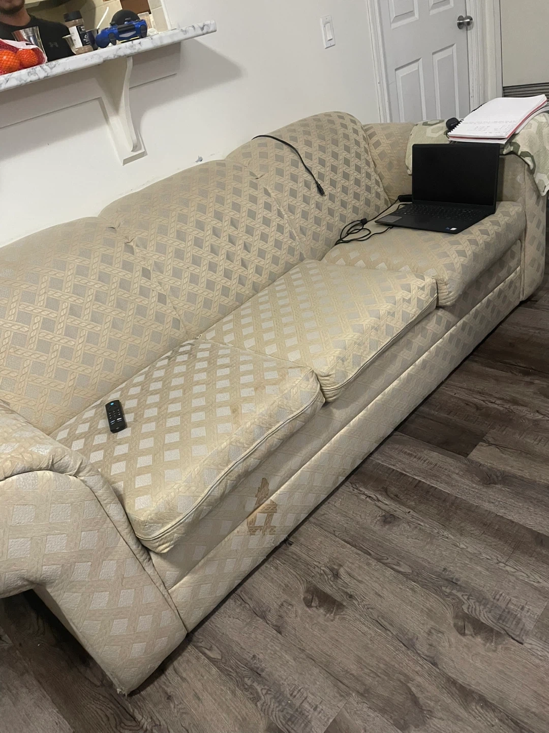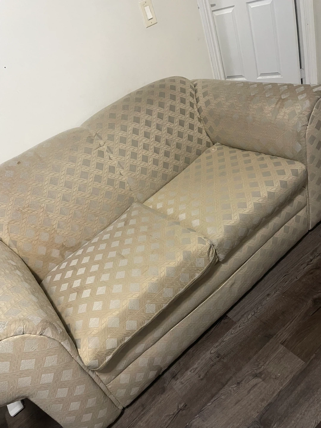 Selling a comfy beige sofa with a unique patterned design. It's perfect for a living room or den. There are some signs of wear, but it's still very functional and cozy.