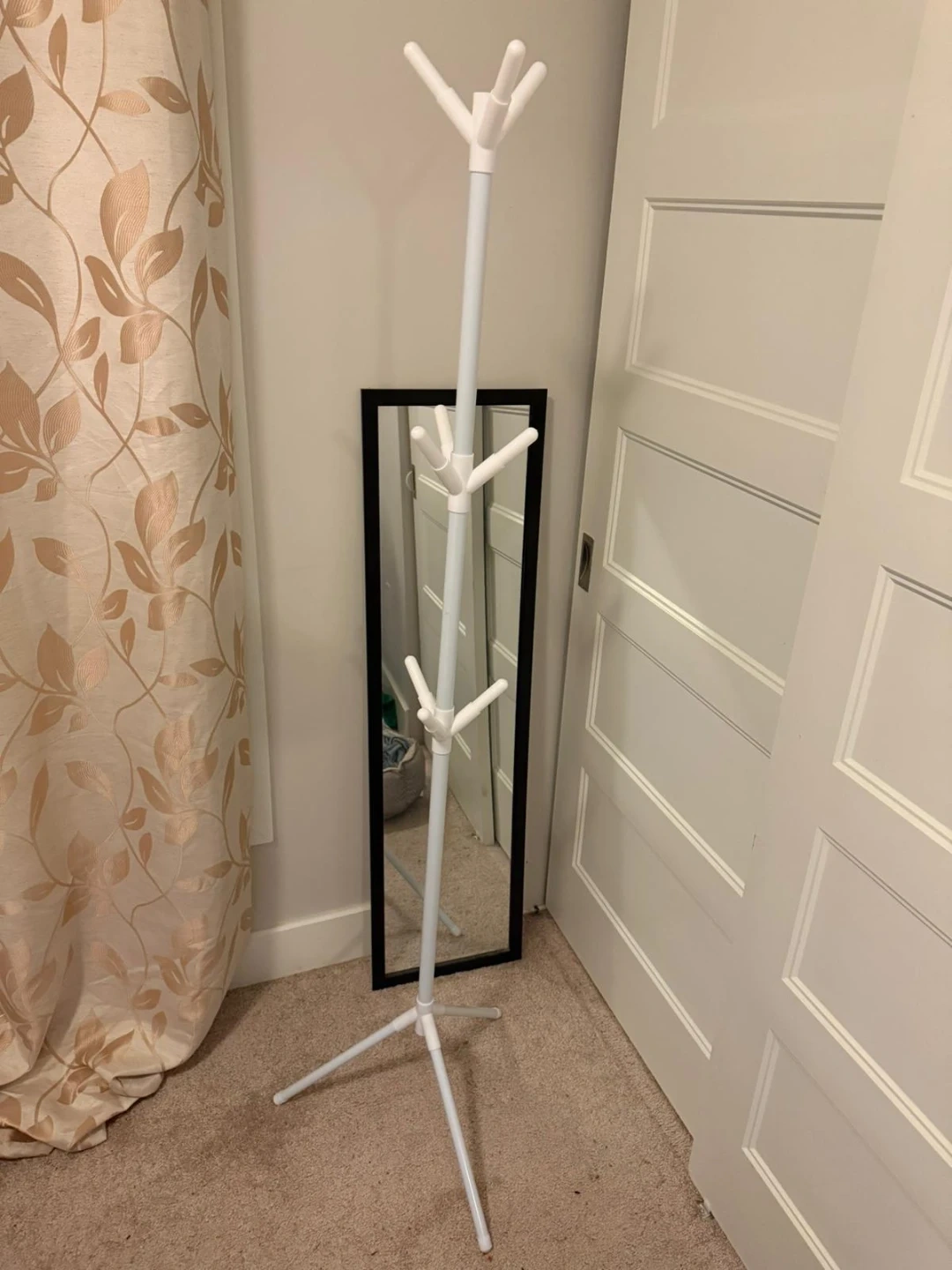 Selling a handy coat rack stand! It's white and in great shape, perfect for keeping your coats and hats organized. It has a simple design that fits easily into any room