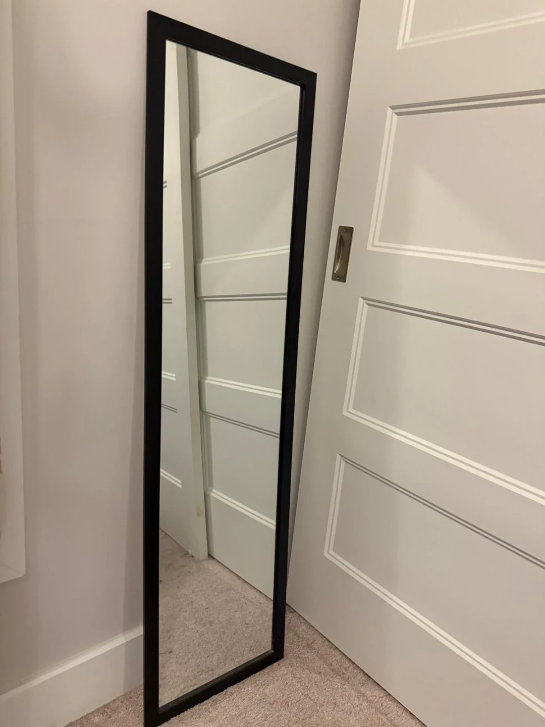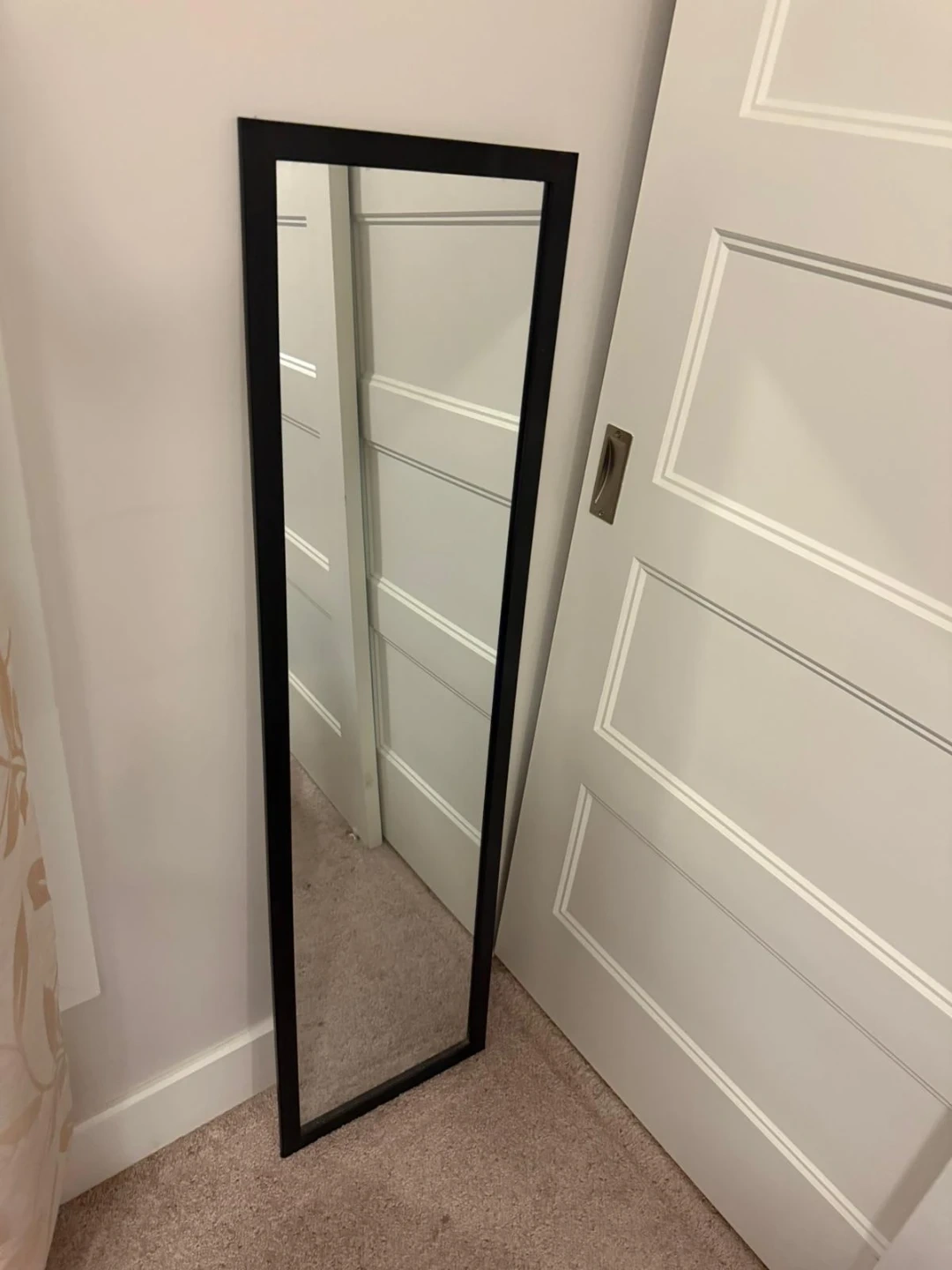 Selling a full-length mirror with a sleek black frame! It's in great condition and ready to brighten up your space. Perfect for checking out your outfit or adding a touch of elegance to any room