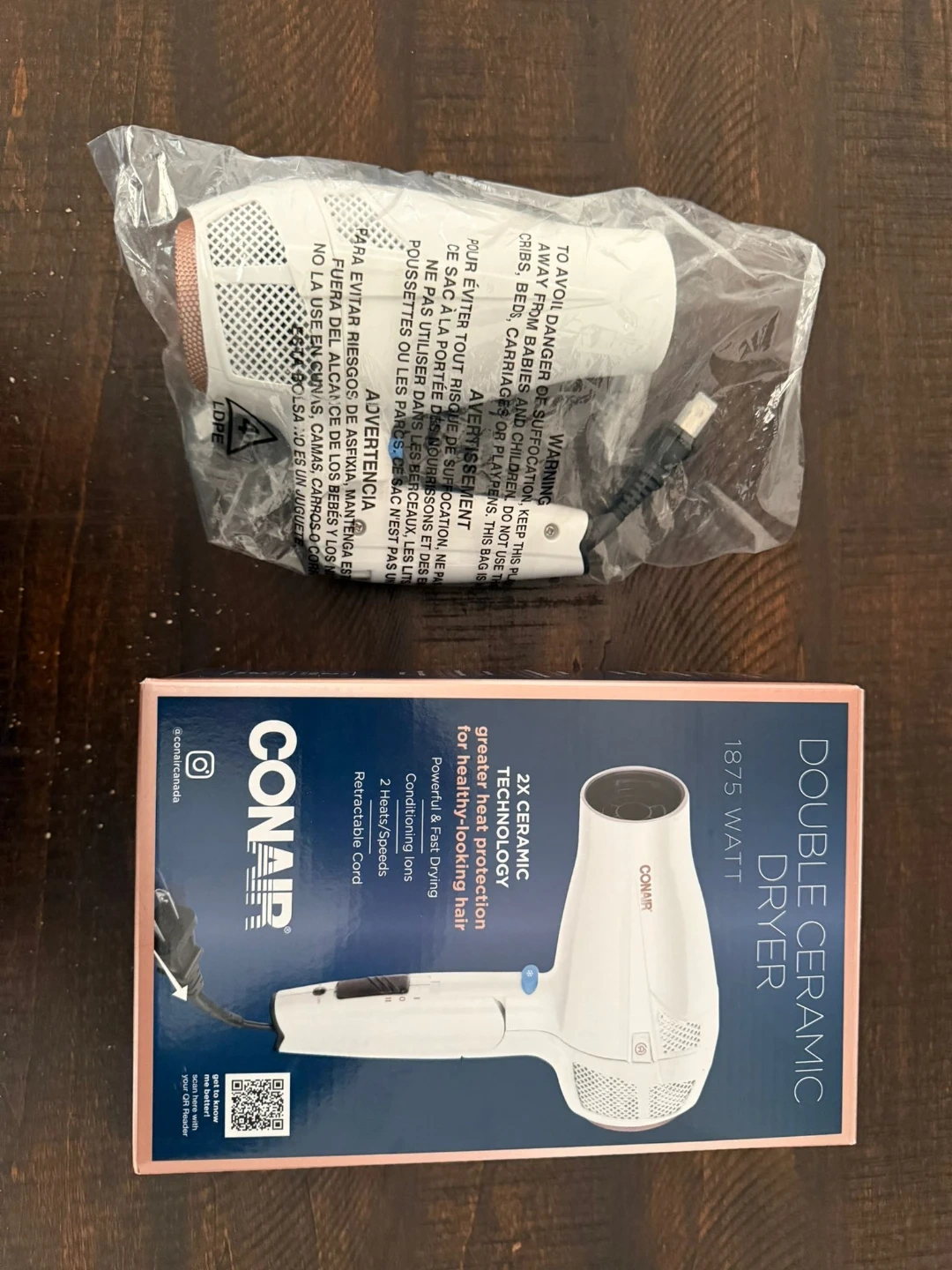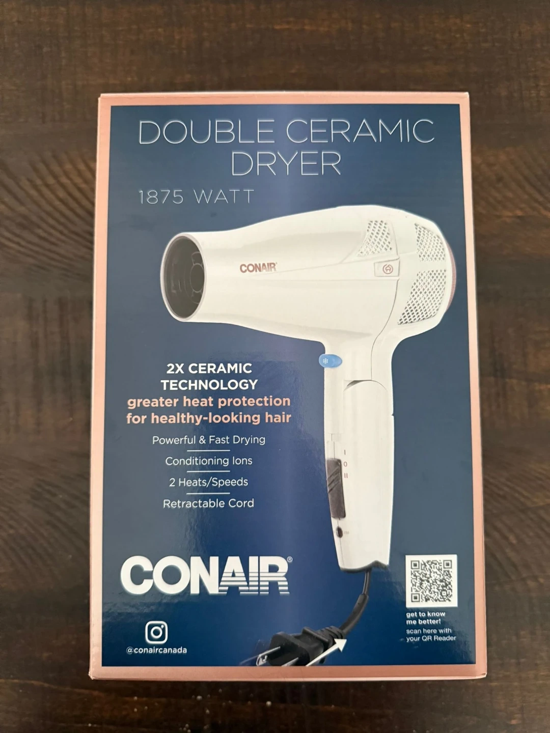 I'm selling a brand new Conair Double Ceramic Dryer. It's 1875 watts and features 2X Ceramic Technology for greater heat protection, helping you achieve healthy-looking hair. It's powerful and fast drying, with conditioning ions, 2 heat/speed settings, and a retractable cord. The box is included!