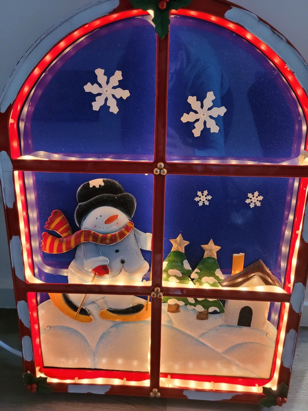 Cute 24" light-up winter snowman Christmas display. Works perfectly. Hanger installed, or prop it up on a side table.