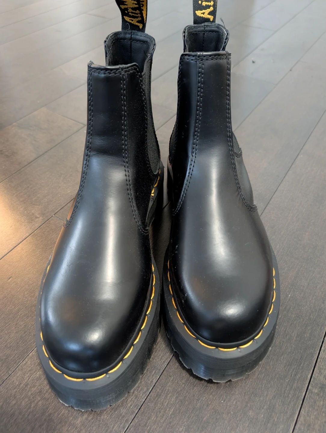 Selling a pair of Dr. Martens 2976 Quad Chelsea boots in black. They're a women's US size 9. These have a polished smooth finish and the original box is included!