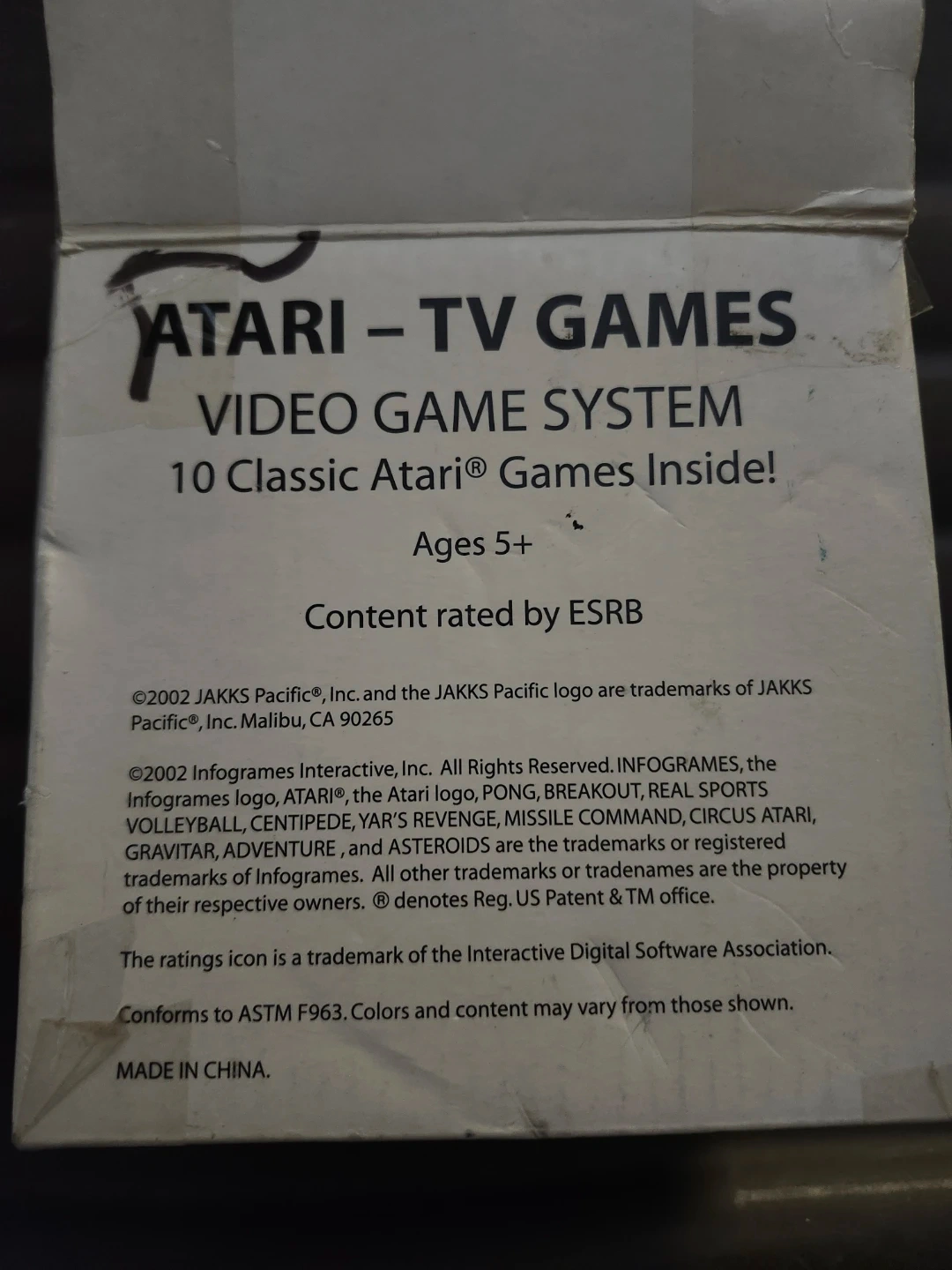 10Selling an Atari TV Games video game system. It includes 10 classic Atari games and is suitable for ages 5+. Content is rated by ESRB. Made in China.