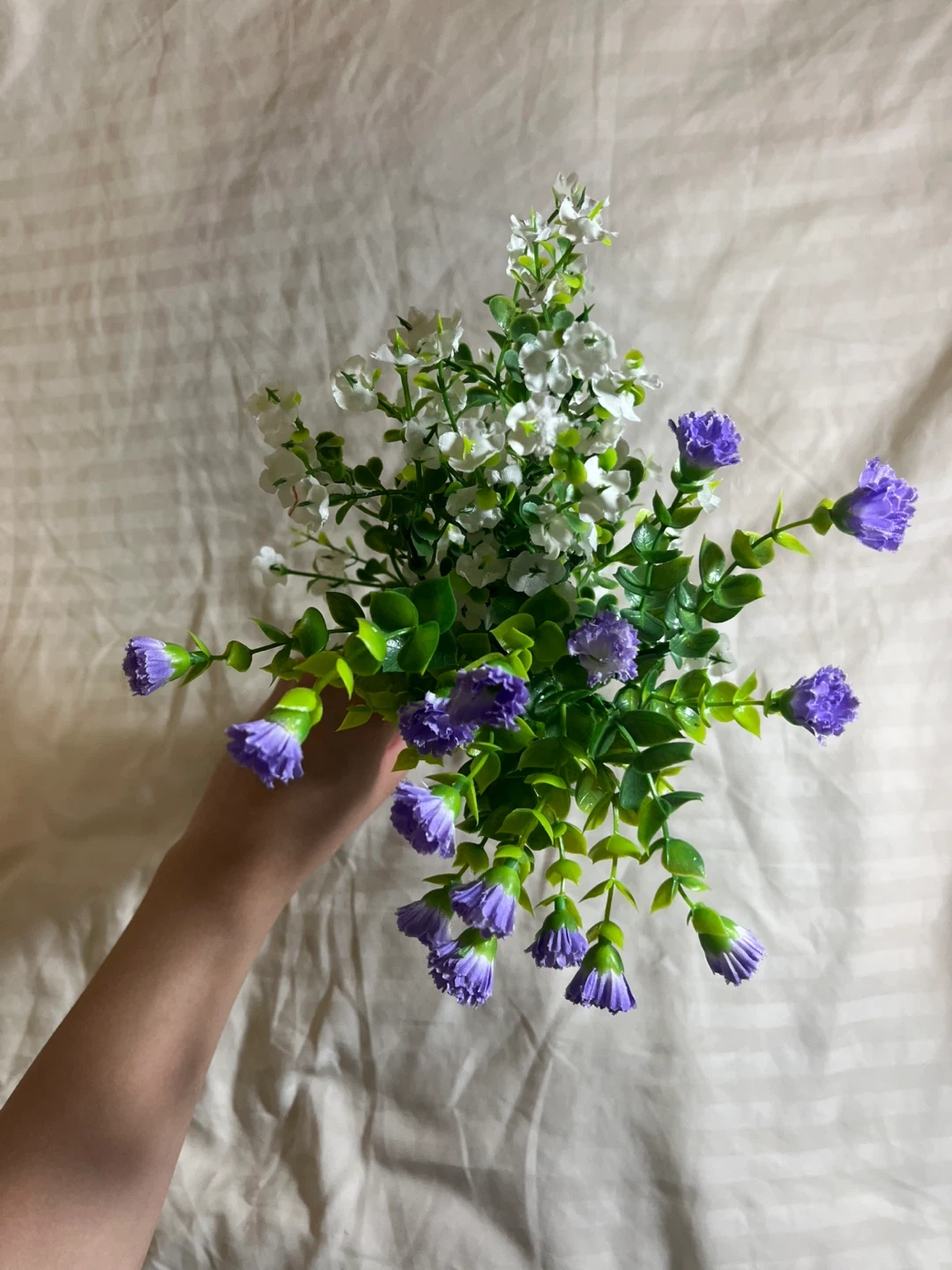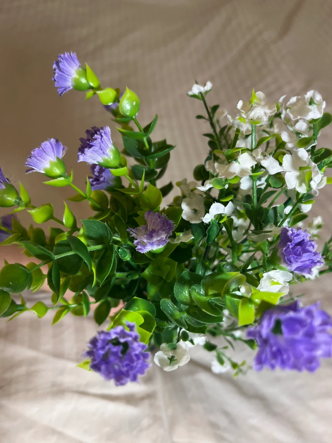 Selling a bundle of artificial flowers! These are perfect for adding a touch of colour to any room. One bunch features pretty purple flowers, while the other has delicate white blooms. They're in great condition and ready to brighten up your space.