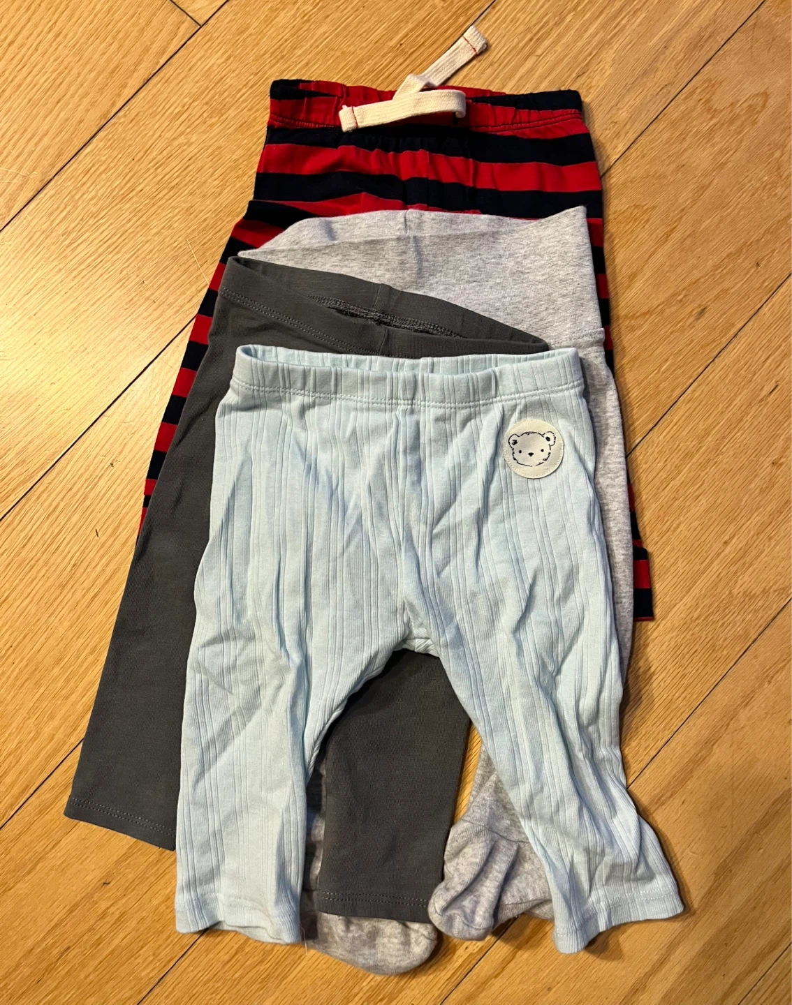 Selling 4 baby leggings. Includes red/navy striped, light grey, dark grey and light blue leggings.