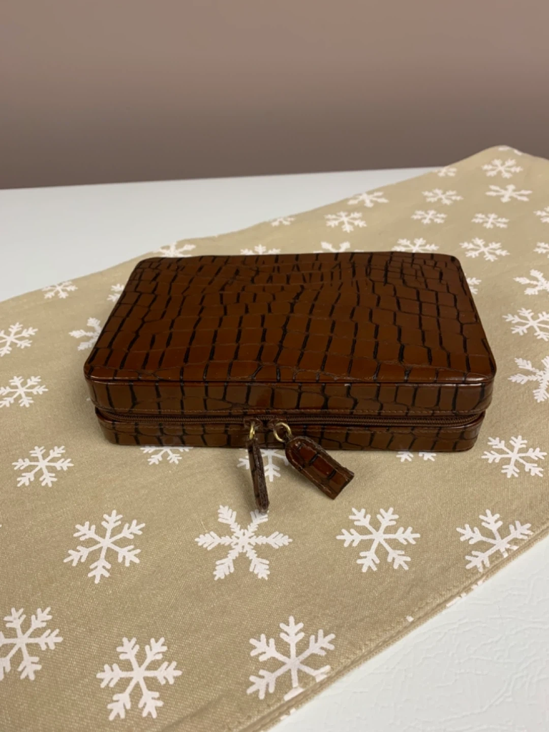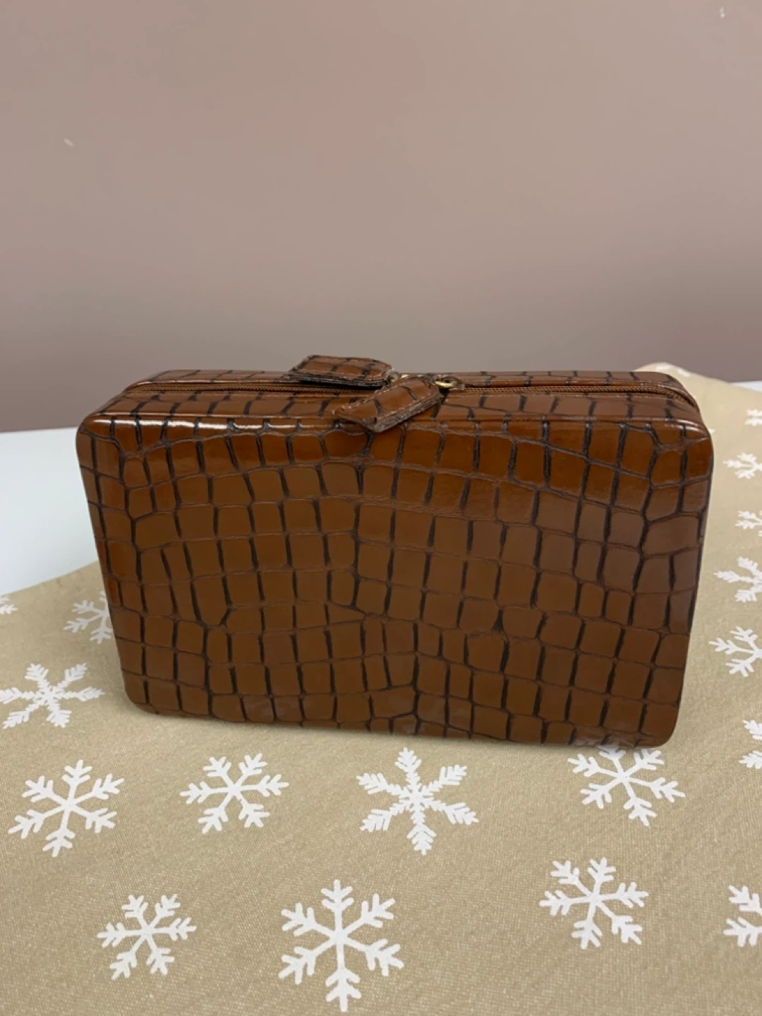 83Here's a lovely brown jewelry travel box with a faux crocodile leather pattern. It's in great condition and perfect for storing your jewelry for travelling. The interior is a soft brown material, and it zips closed to keep everything secure. It measures approximately 7 inches long and 4 inches wide.