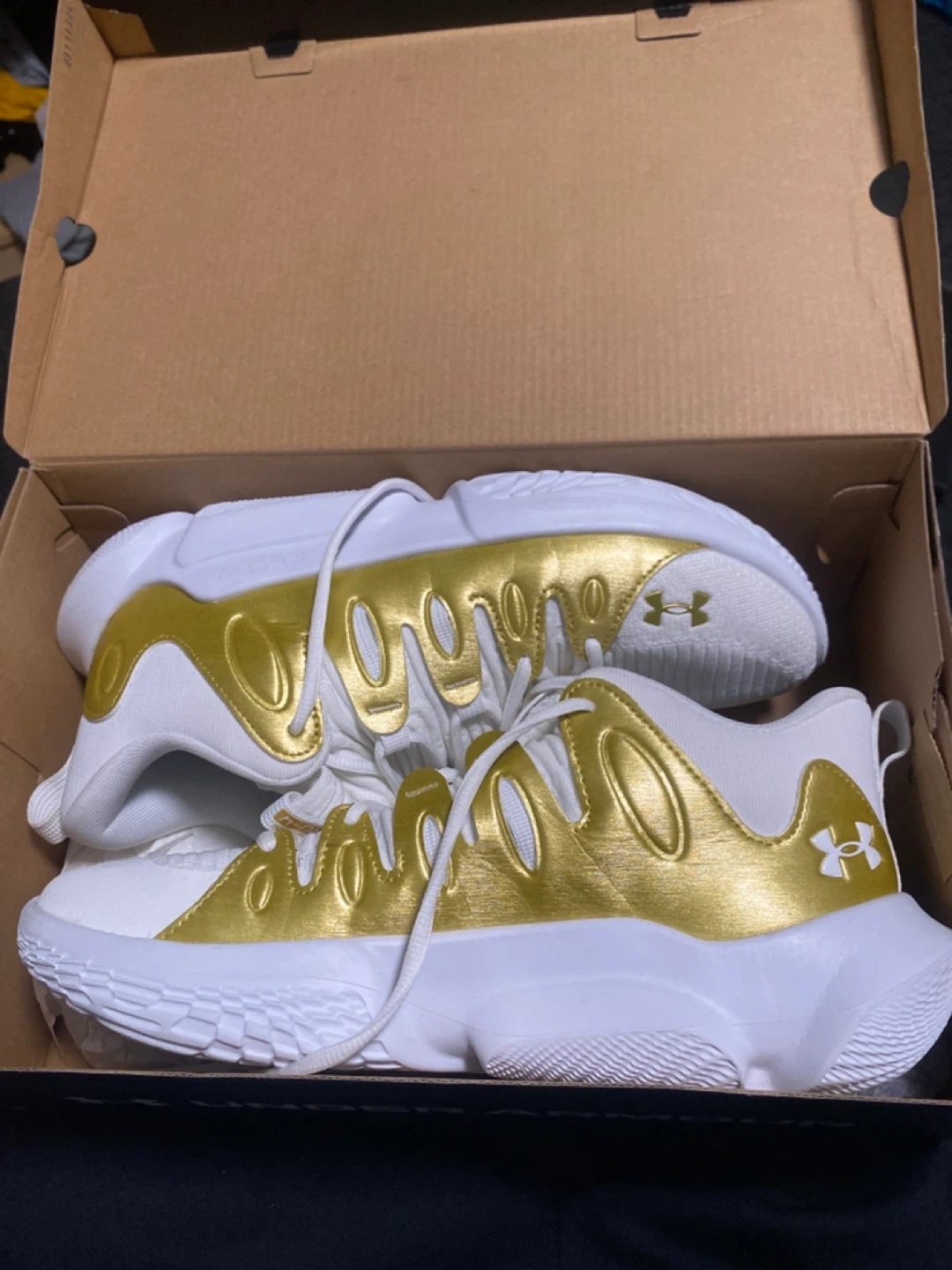 10Selling a pair of Under Armour Spawn Anatomix shoes in white and gold. They come with the original box!