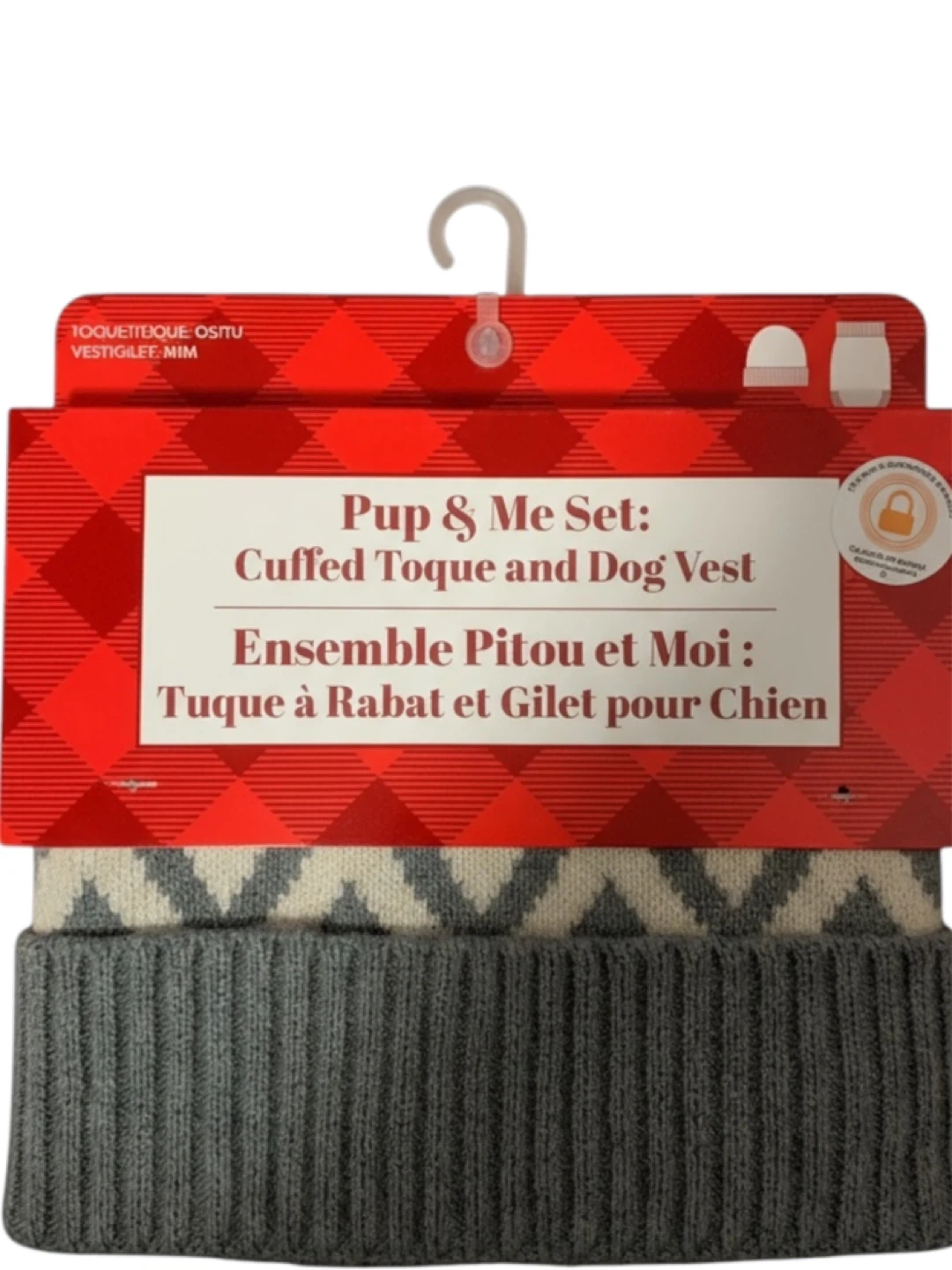 Stay cozy and coordinated with your furry friend this winter! The Pup & Me Set includes a stylish cuffed toque for you and a matching knit vest for your dog, perfect for chilly walks and photo-ready moments.