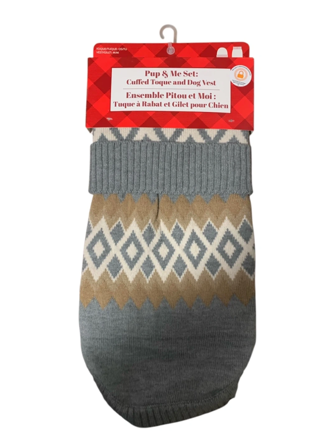 Pup & Me Set: Cuffed Toque and Dog Vest β Grey Pattern