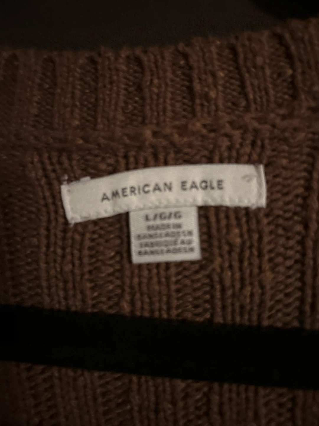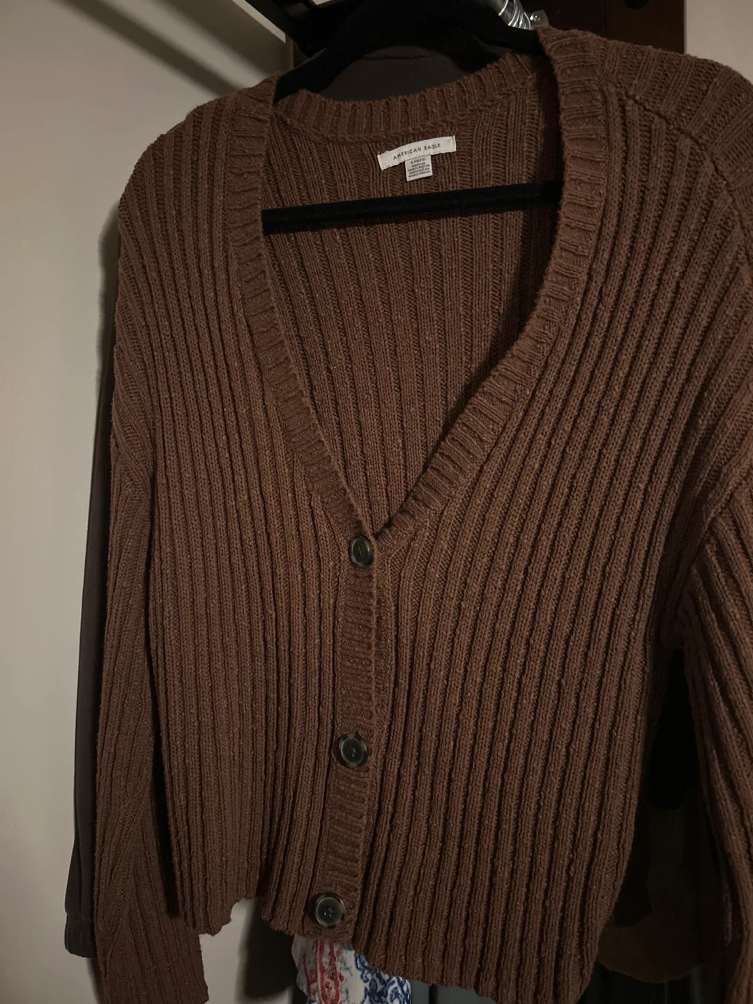 Cozy American Eagle cardigan in a lovely brown colour. It's a size large and made with 52% cotton, 42% acrylic, and 6% polyester. Perfect for layering!