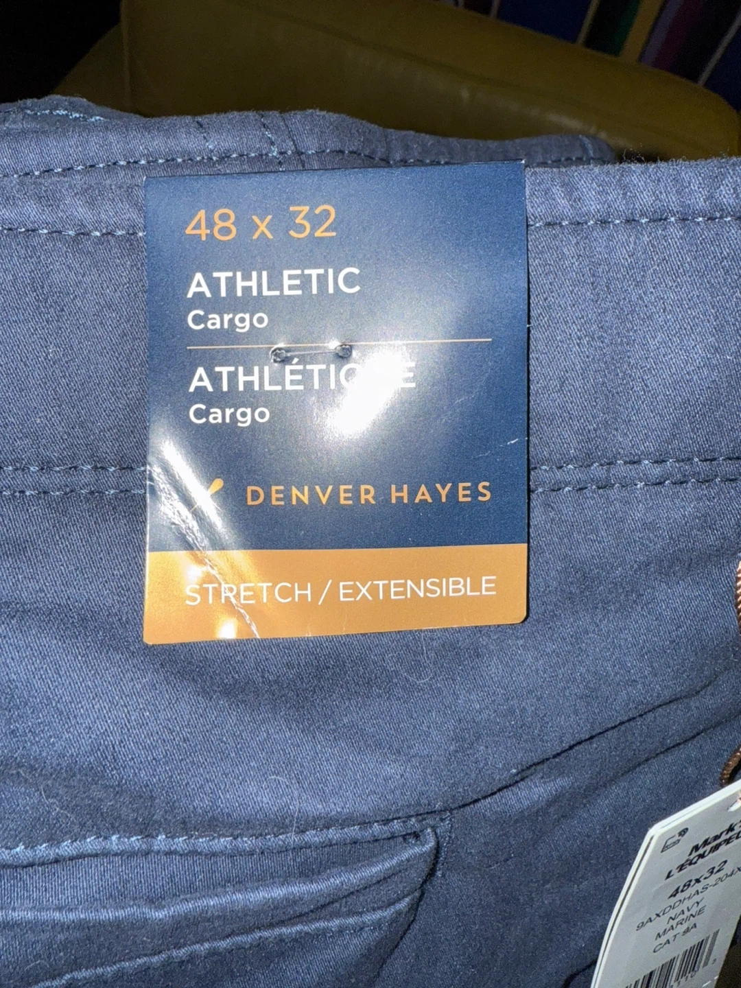 I'm selling a brand new pair of Denver Hayes Athletic Cargo pants! They are a size 48x32 and come in a navy colour. The original price was $64.99.