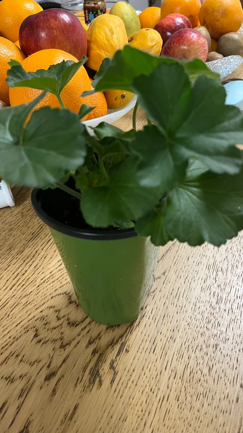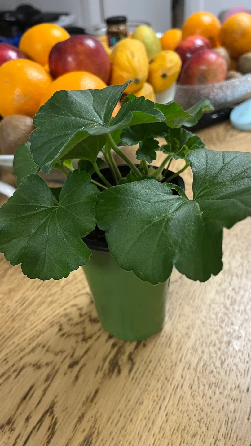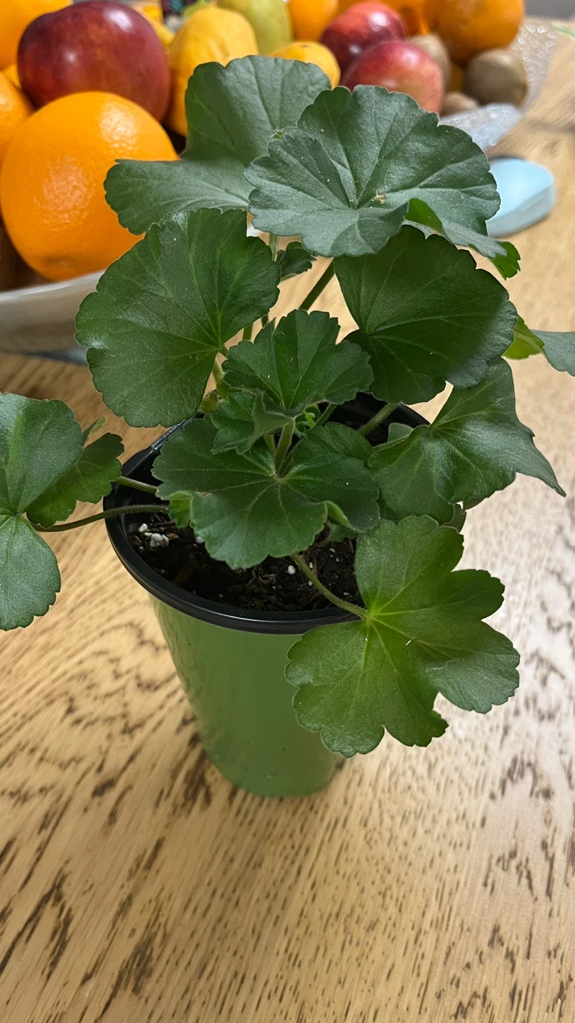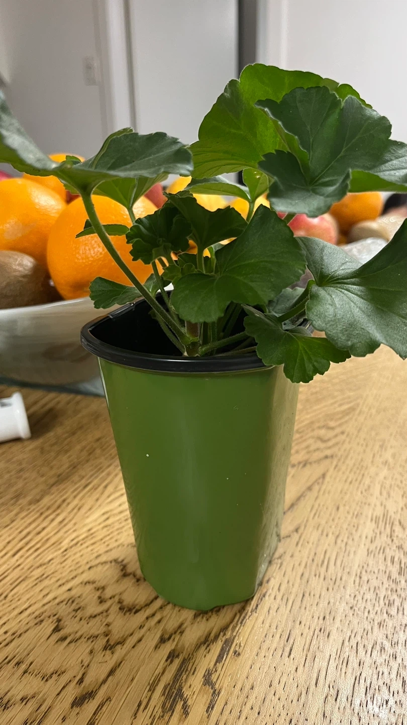 A healthy geranium plant in a green pot, ready to brighten up your space! It's currently thriving and looking for a new home to flourish in. I have two plants.