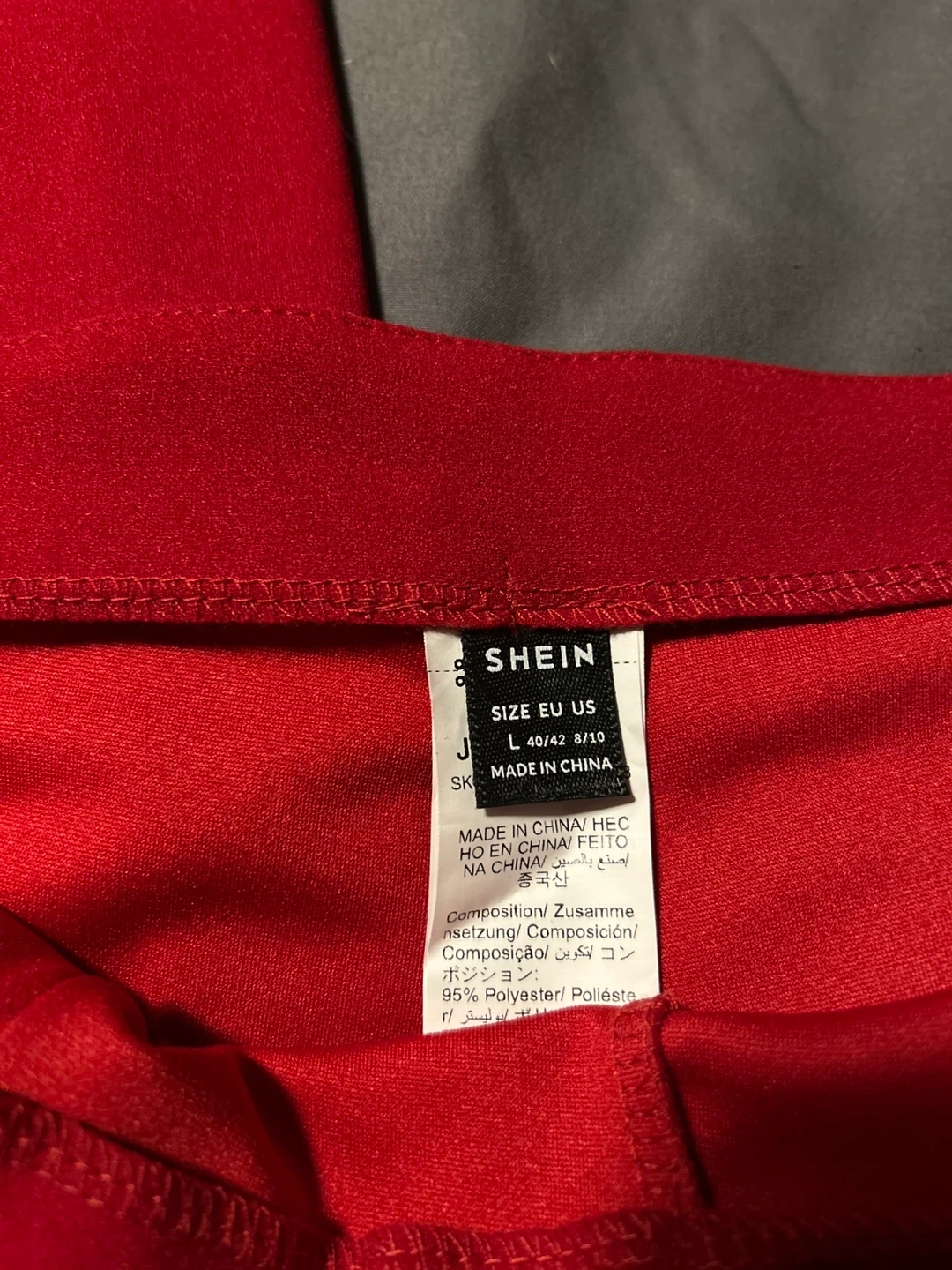 Bright red wide leg pants from Shein! These are a size L (EU 40/42, US 8/10) and are made in China. The material is 95% polyester. Perfect for adding a pop of colour to your wardrobe