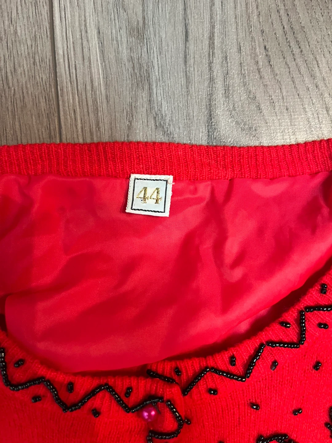Selling a vibrant red cardigan with beautiful black bead detailing! It's a size 44 and would be a lovely addition to any wardrobe.