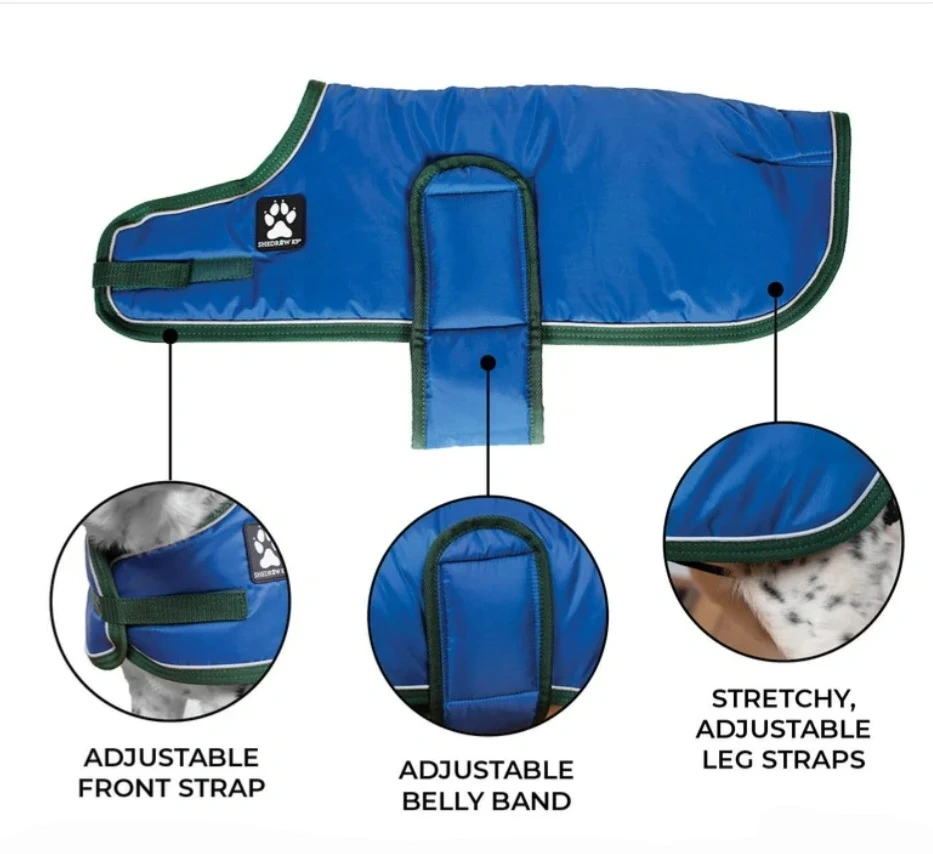 It's in great condition and ready to keep your furry friend warm and dry! The coat features adjustable front and belly straps, plus stretchy, adjustable leg straps for a snug and comfortable fit. Perfect for pugs, Westies, Dachshunds, and Corgis!