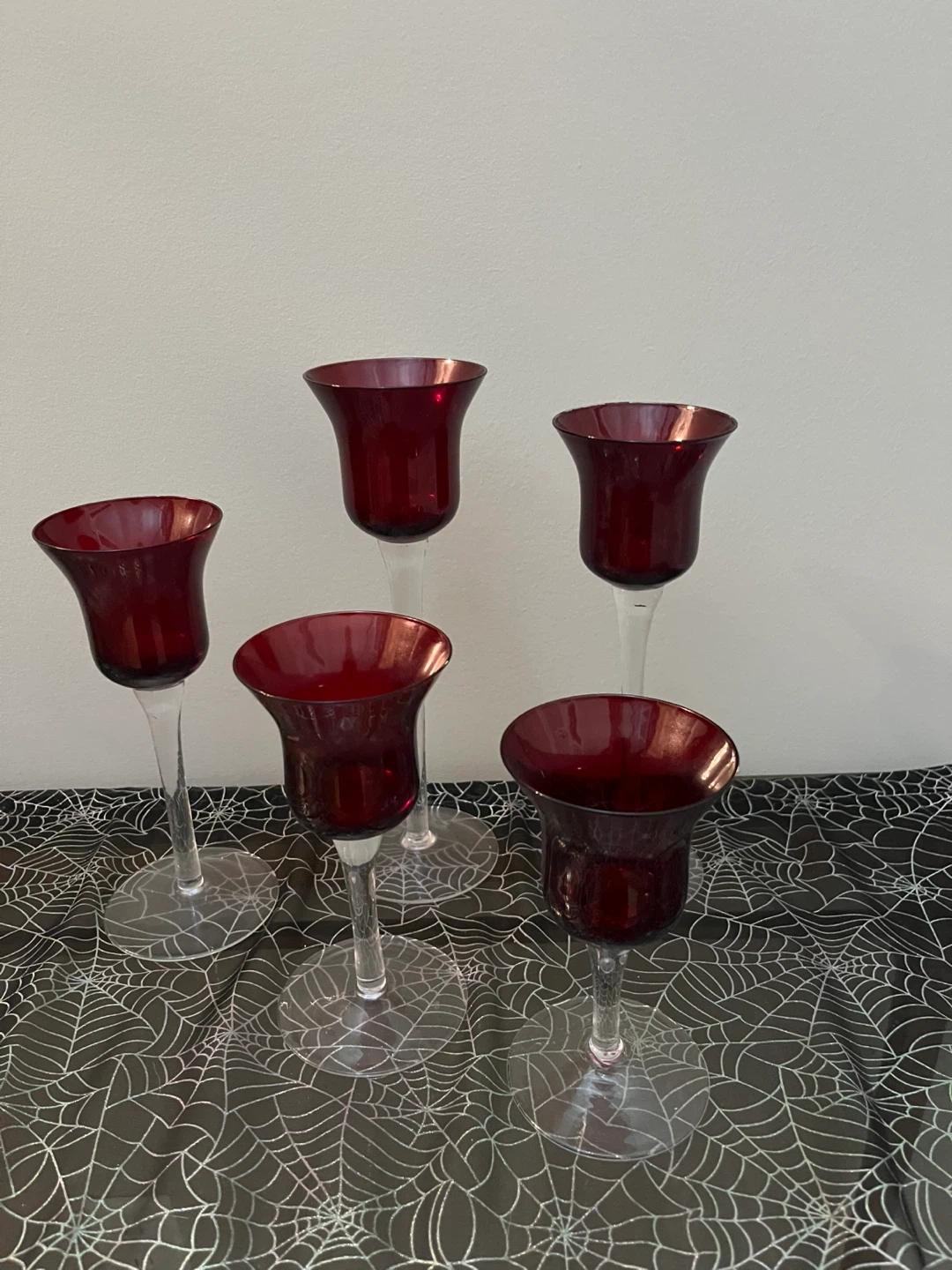 65Selling a set of 5 elegant red glass candle holders! They're in great shape and come in a protective cardboard box for easy transport. Perfect for adding a touch of warmth to any room