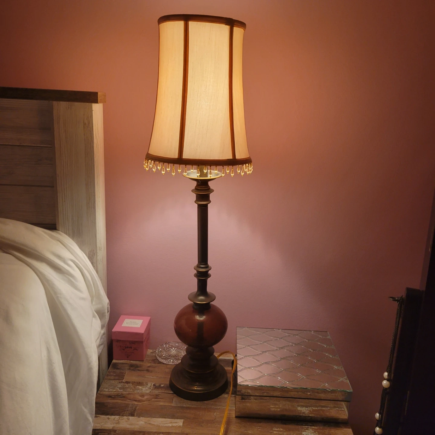 A lovely vintage-style table lamp that adds a touch of warmth to any room! It features a classic lampshade design with decorative beaded trim. The base is a dark wood tone, and the lamp provides a cozy ambient light. Perfect for a bedside table or living room accent