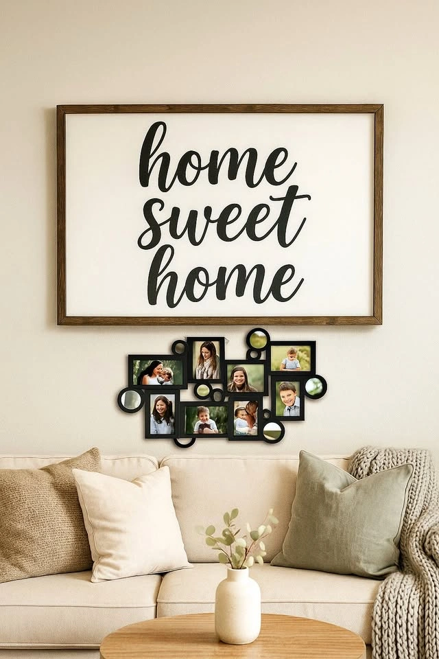 60Just the multi-photo frame, not home sweet home. Add some personality to your space with this sleek black multi-frame wall décor piece. Measuring approximately 35 inches wide by 20 inches high, it’s perfect for displaying your favorite family memories or artistic prints. The modern geometric design combines rectangular and circular frames for a unique statement look. Lightweight and easy to hang, it instantly upgrades any living room, hallway, or entryway. Condition: Gently used, great shape. ✨ Stylish, modern, and ready to make your wall pop!