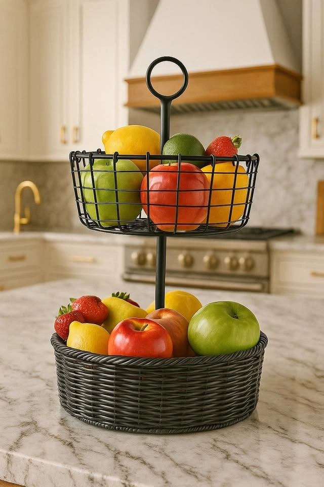 60A beautiful balance of style and practicality — this two-tier fruit basket elevates any kitchen space with its sleek black metal and woven base. Ideal for showcasing fresh fruit, baked goods, or decorative accents. Its timeless, minimalist design pairs perfectly with marble, wood, or granite countertops. ✨ Excellent condition, sturdy and clean. 🏡 A statement piece that makes your kitchen feel like a magazine spread. Two-Tier Fruit Basket – Modern Black Metal & Woven Design