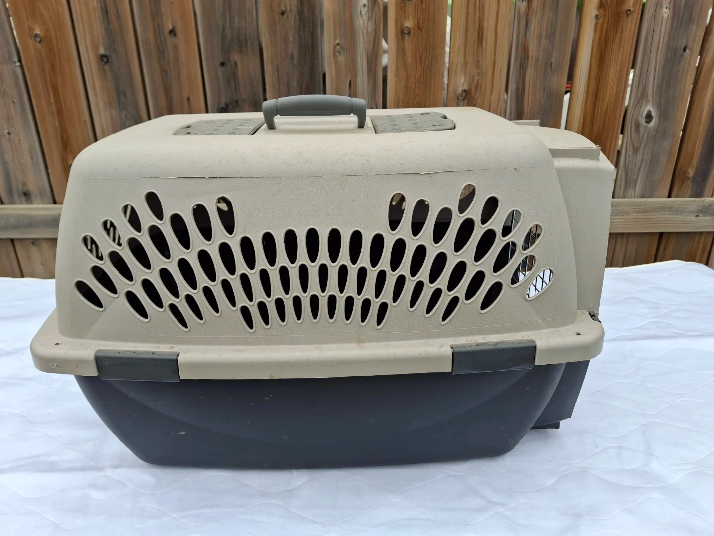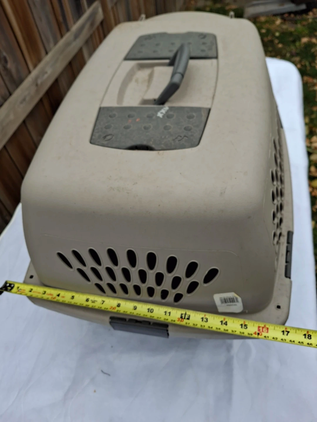 Selling a Petmate pet carrier kennel. It's in good condition and ready for your furry friend's travels! The kennel measures approximately 27 inches long, 17 inches wide, and 20 inches tall, providing ample space for a comfortable journey