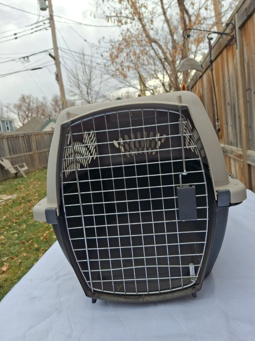 Selling a Petmate pet carrier kennel. It's in good condition and ready for your furry friend's travels! The kennel measures approximately 27 inches long, 17 inches wide, and 20 inches tall, providing ample space for a comfortable journey