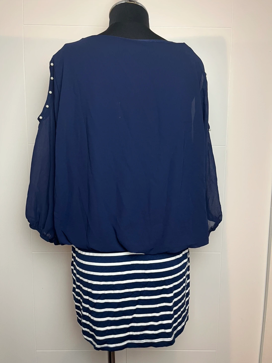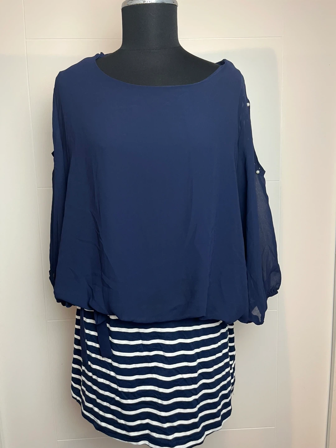 Here's a navy blue blouse from Ei Shing Fashion. It has a unique design with pearl accents on the sleeves. Perfect for adding a touch of elegance to your wardrobe!