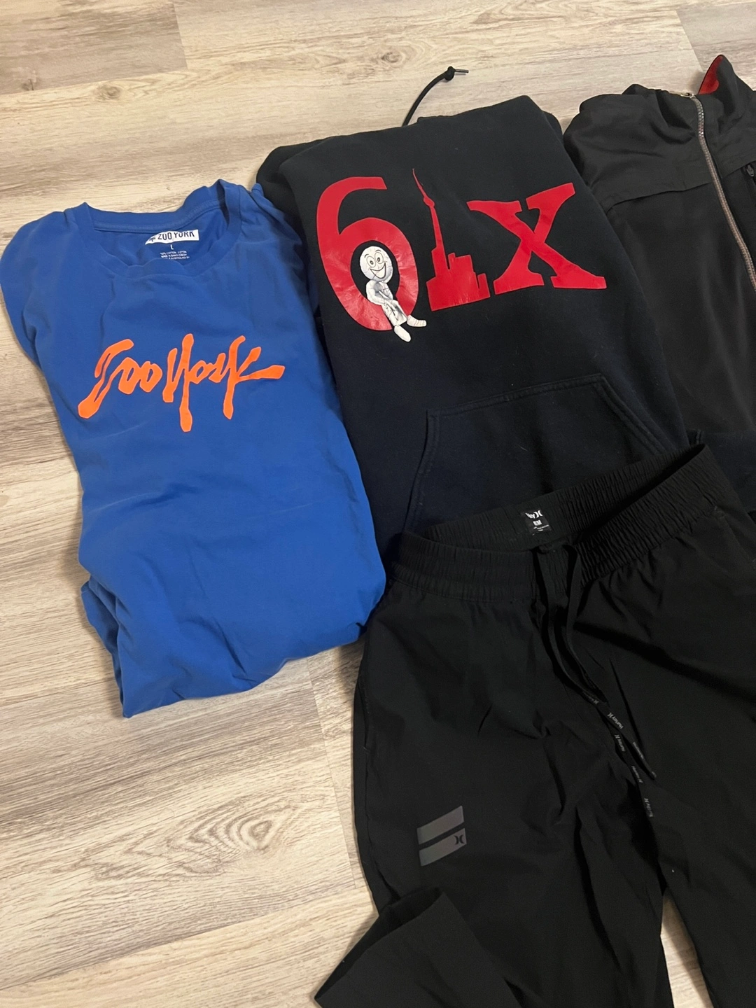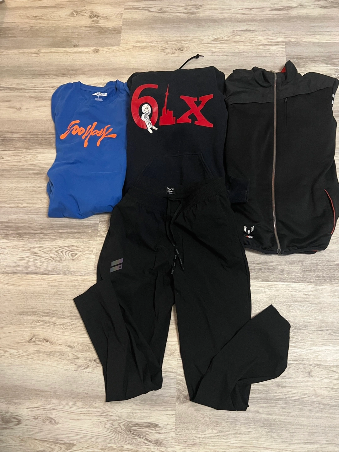 Selling a bundle of youth/men assorted clothing items. Includes a Zoo York t-shirt, a 6IX hoodie, Hurley bottoms, and a Messi jacket. All items are in good condition and ready for a new home. Size from M to large. From smoke free home. Please check my other posts.
