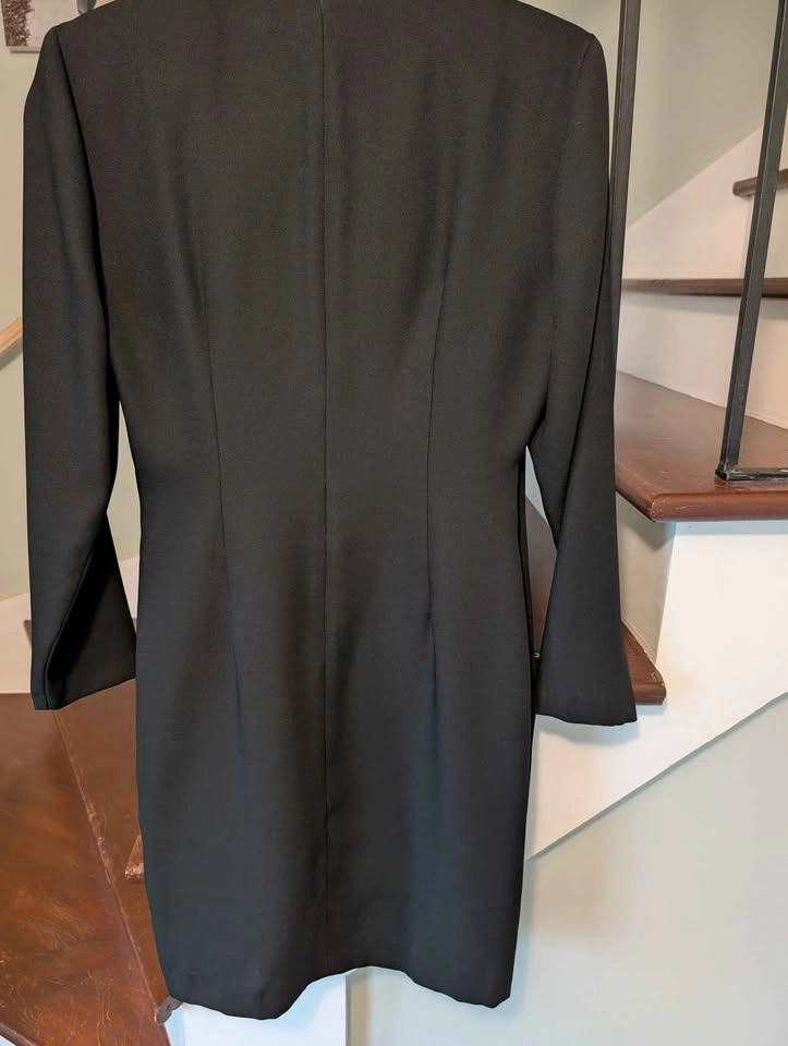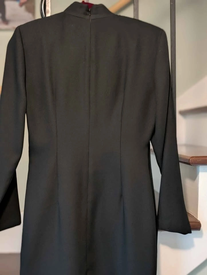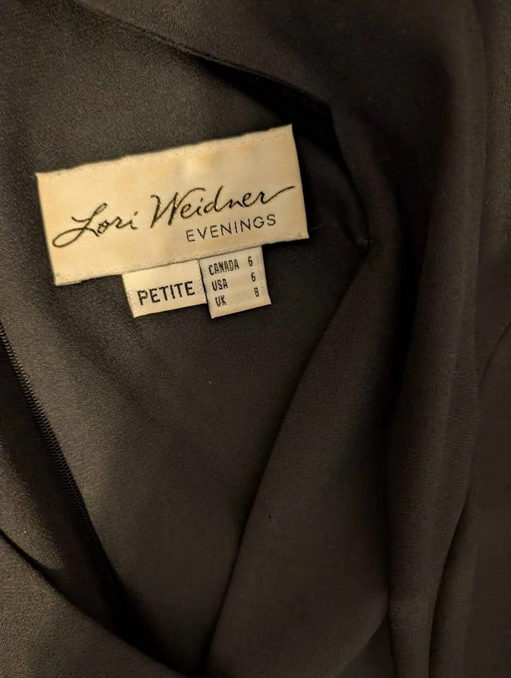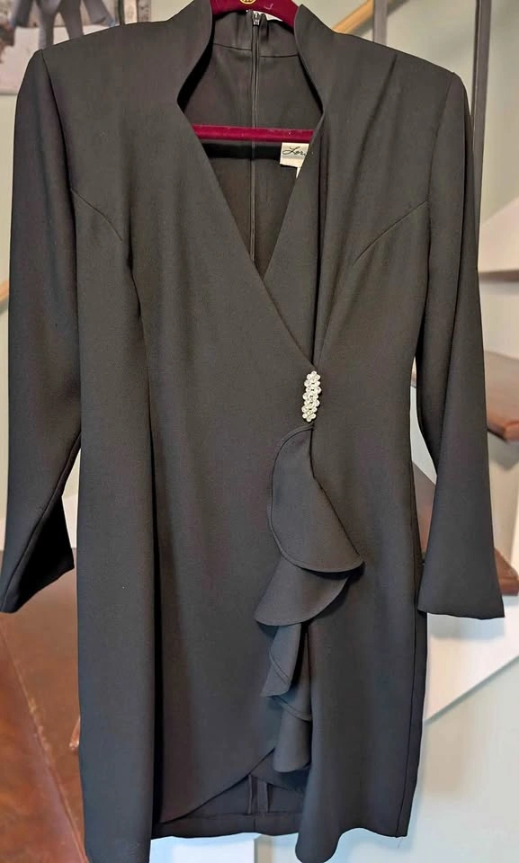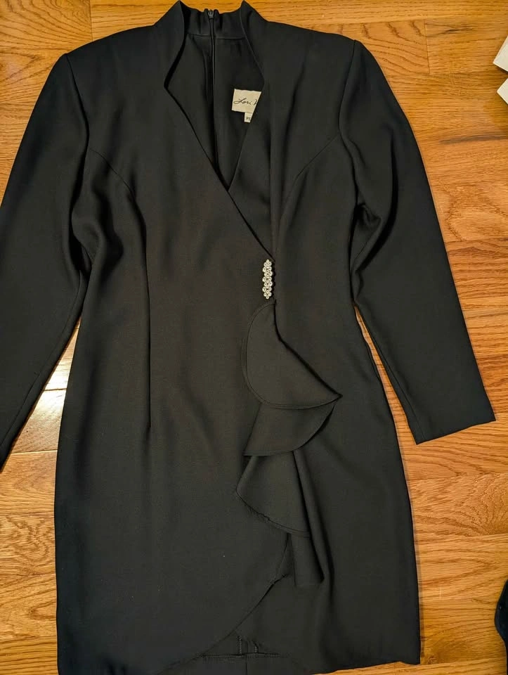 21Fitted, faux wrap, V neck evening dress with a tiered side ruffle and a rhinestone brouch. It has long sleeves, stand-up back collar and a zippered back. A truly vintage, sexy black dress in very good condition. Fits generously, like a size 8 or 10. North St Catharines pickup, cash only please