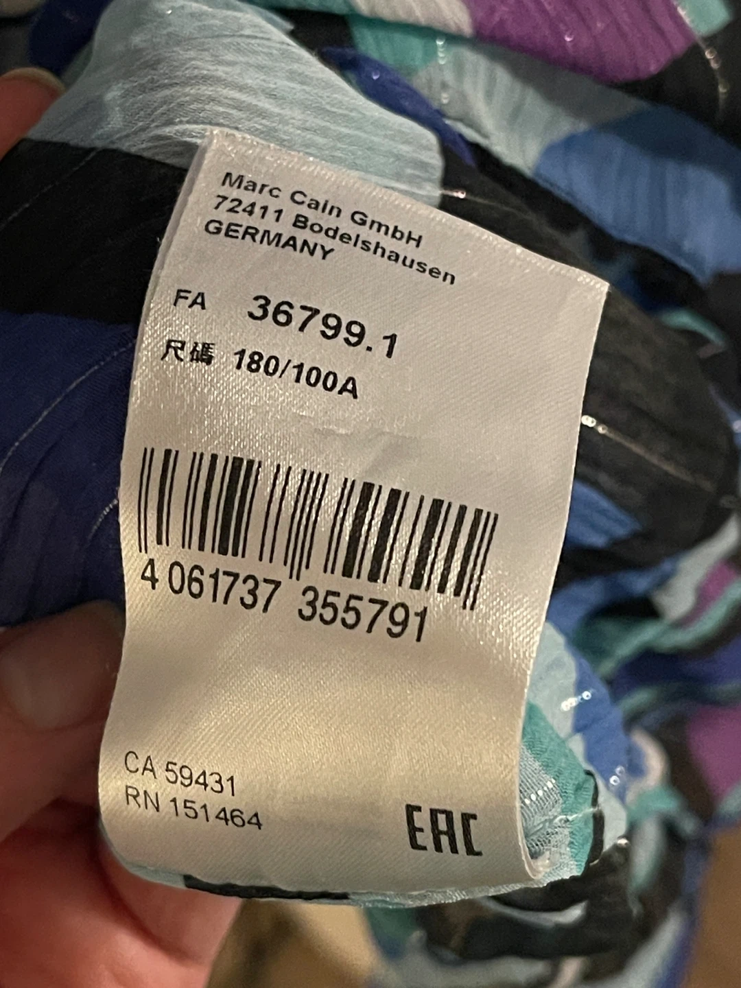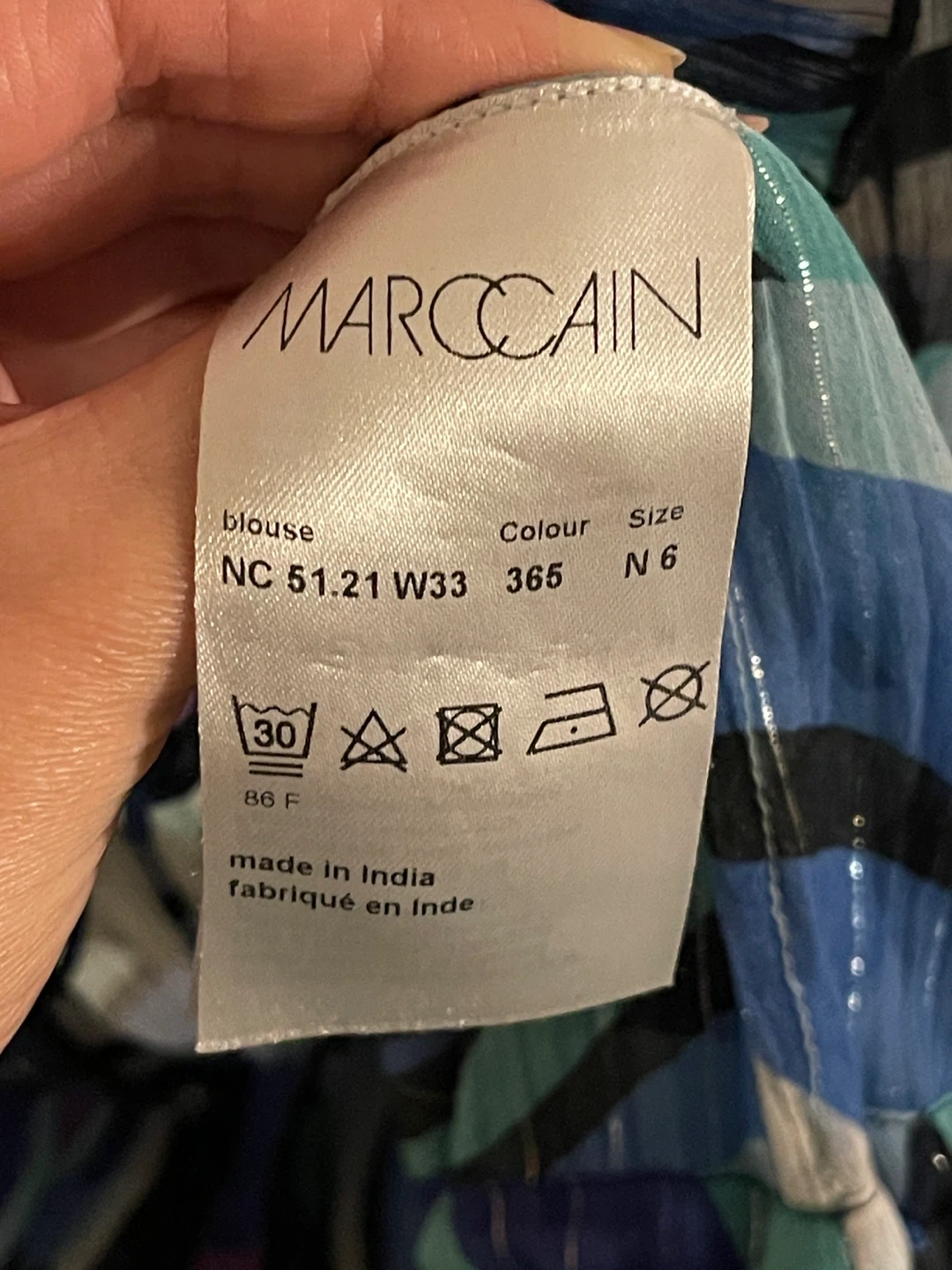 In excellent pre-owned condition. Size N6 (US 12). To wear as a dress it would be ideal for sizes US 8-10. To wear as a blouse then great for sizes US 10-12. Elevate your wardrobe with this stunning Marc Cain designer blouse. Crafted from lightweight semi-sheer fabric with a textured crinkle finish, this top features a vibrant abstract print in shades of blue, aqua, black, and violet. Semi-sheer blouse featuring a vivid abstract print in shades of blue, purple, and teal. Designed with a ruffled tie-neck, soft crinkle texture, and adjustable side drawstrings for a flattering, customizable silhouette. A perfect balance of feminine and modern style. DETAILS: • Style: NC 51.21 W33, RN 151464 / CA 59431 • Size: N 6 (equivalent to approx. US 10-12) • Color: 365 (Blue/Purple Multicolor) • Ruffled front with tie-neck detail • 3/4 sleeves with ruffles • Lightweight, semi-sheer fabric • Straight hem with side drawstring accents • Pullover style • Made in India • Material: Exact composition not listed on tag, but Marc Cain blouses of this style are typically made from a polyester or viscose blend with slight metallic thread detailing for subtle shimmer.
