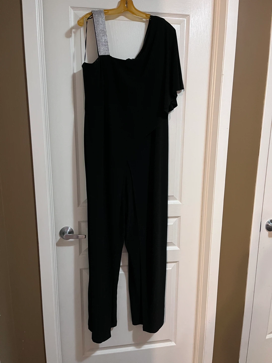 Selling a stylish black jumpsuit! It features a unique one-shoulder design with a rhinestone strap. Perfect for Christmas🎄 or New Year’s🥳