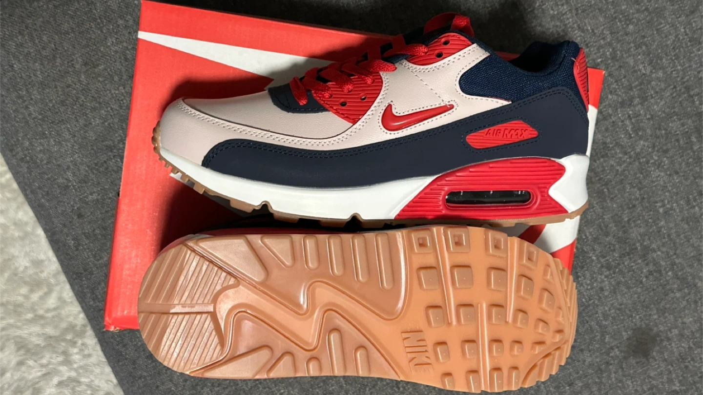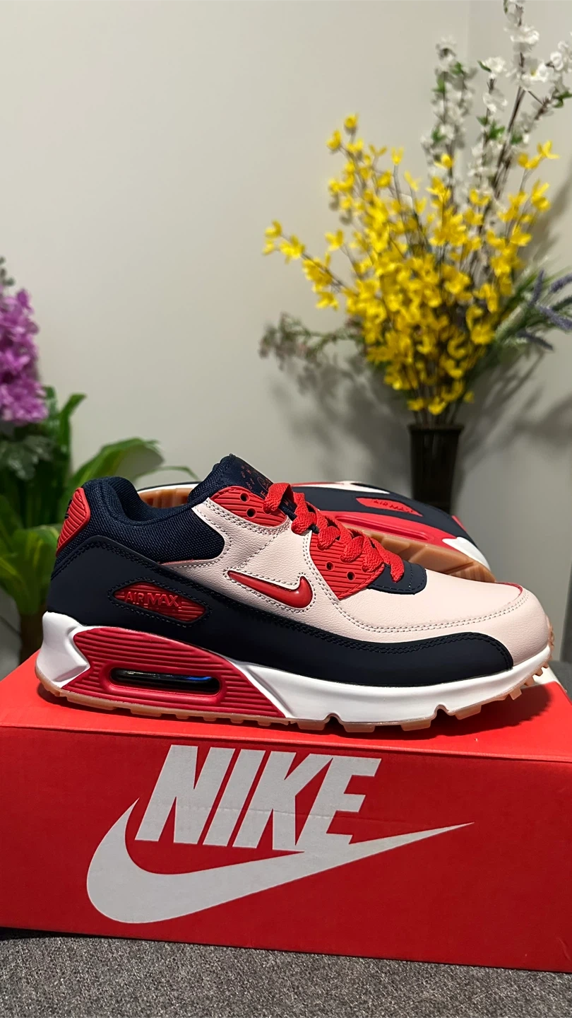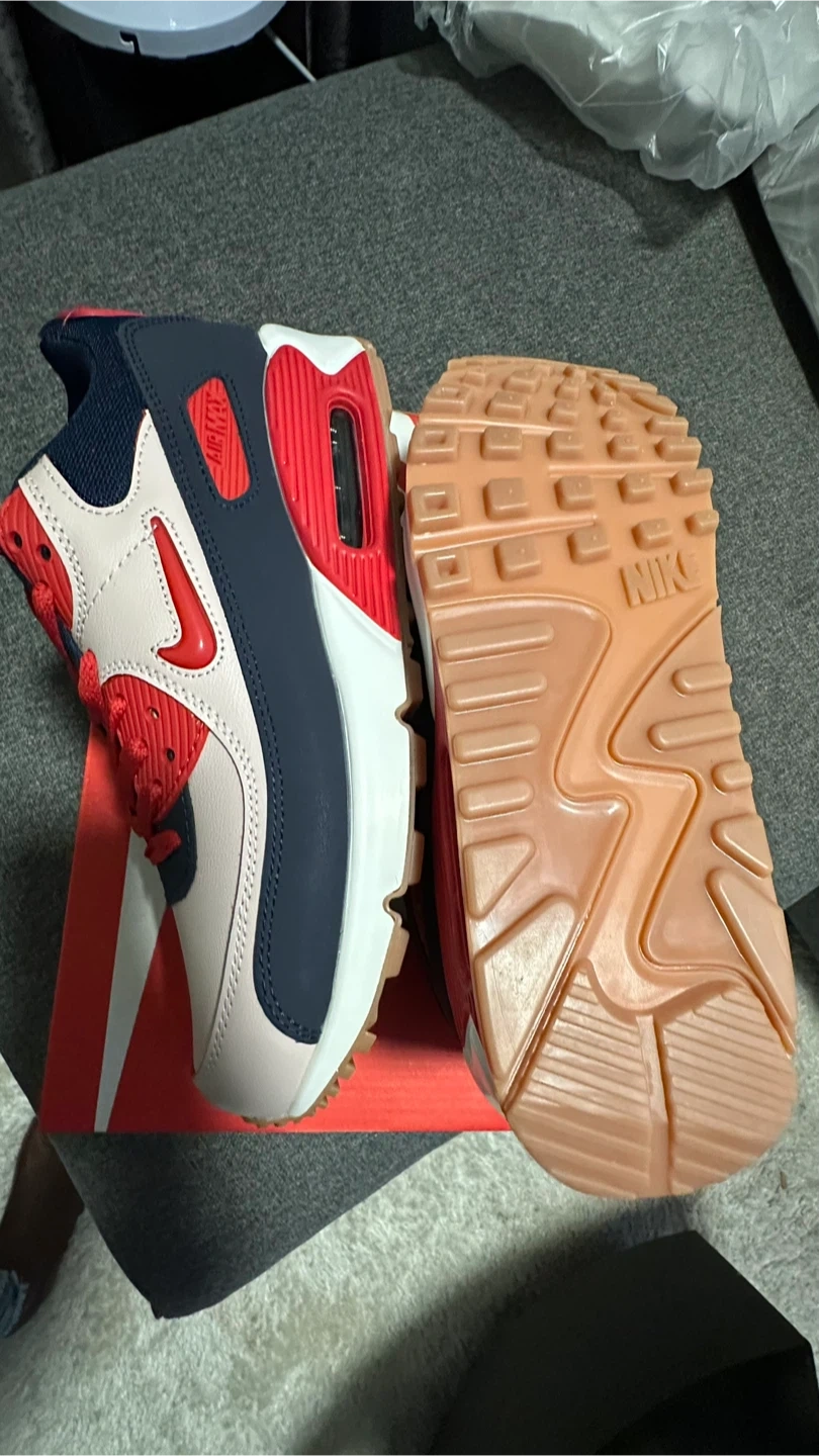Selling a pair of Nike Air Max 90s! They feature a stylish combination of navy, red, and beige. Comes with the original box! Available in size 7 , 8 , 8.5 , 9.5 and 10