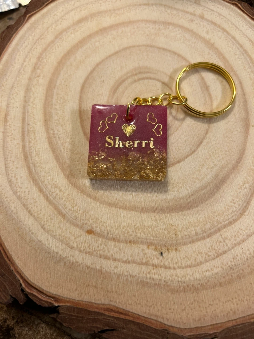 I'm selling a cute, custom keychain. It features the name "Sherri" in gold lettering on a maroon resin background, with gold flakes at the bottom and small hearts at the top. It's attached to a gold-coloured keyring. Your pet name and phone number can be customized