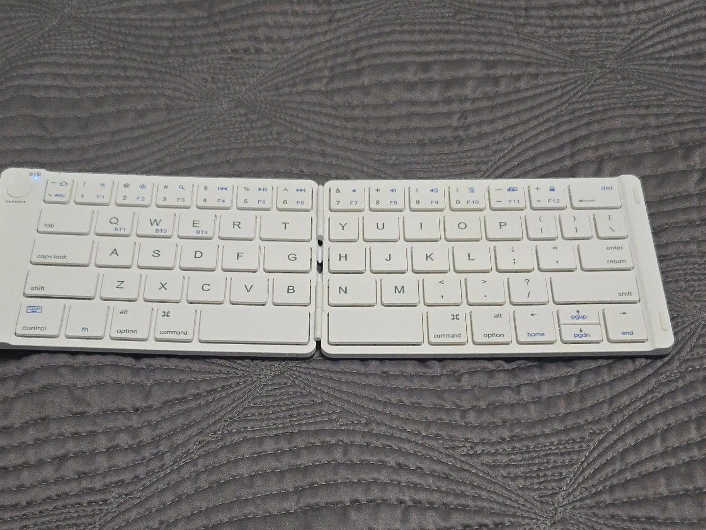 Selling an iClever BK03 folding Bluetooth keyboard in white. It's super lightweight and portable, making it great for travel or working on the go. It folds up nicely for easy storage. If you're interested, send me a message!