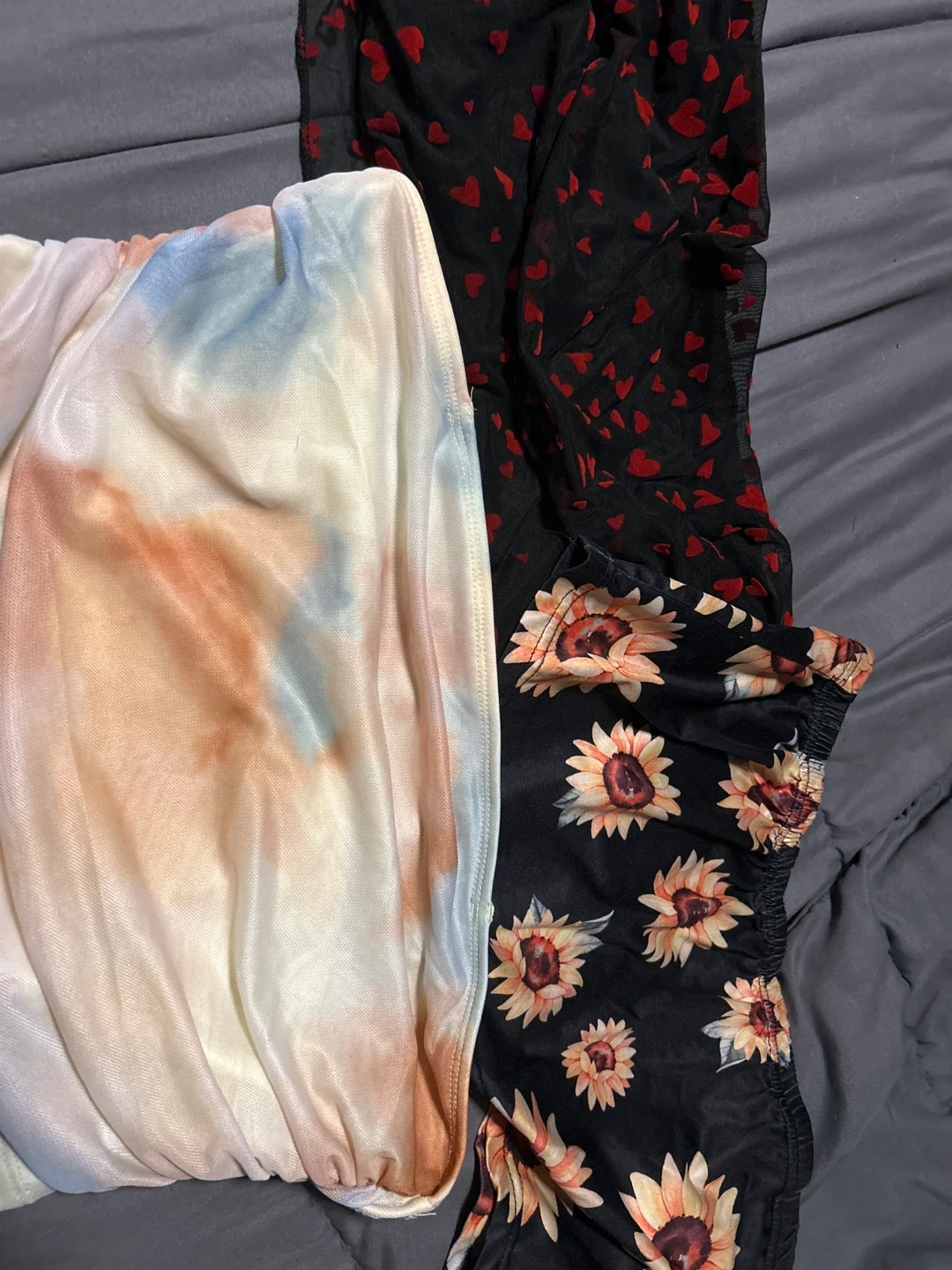 Here are some cute Shein strapless tops ! There are three different, all size large. One is tie dye, one pair is black with red hearts, and the last pair is black with sunflowers.