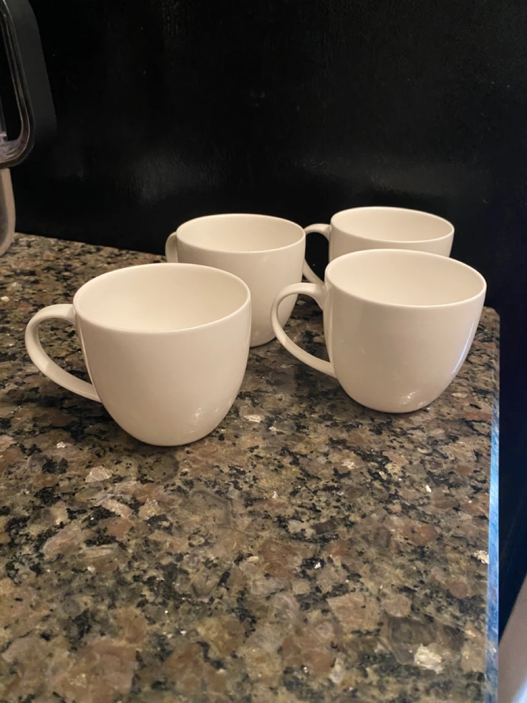 Selling a set of four simple white ceramic mugs! They're in great shape and ready for your favourite warm drinks. Perfect for coffee, tea, or hot chocolate on a chilly day