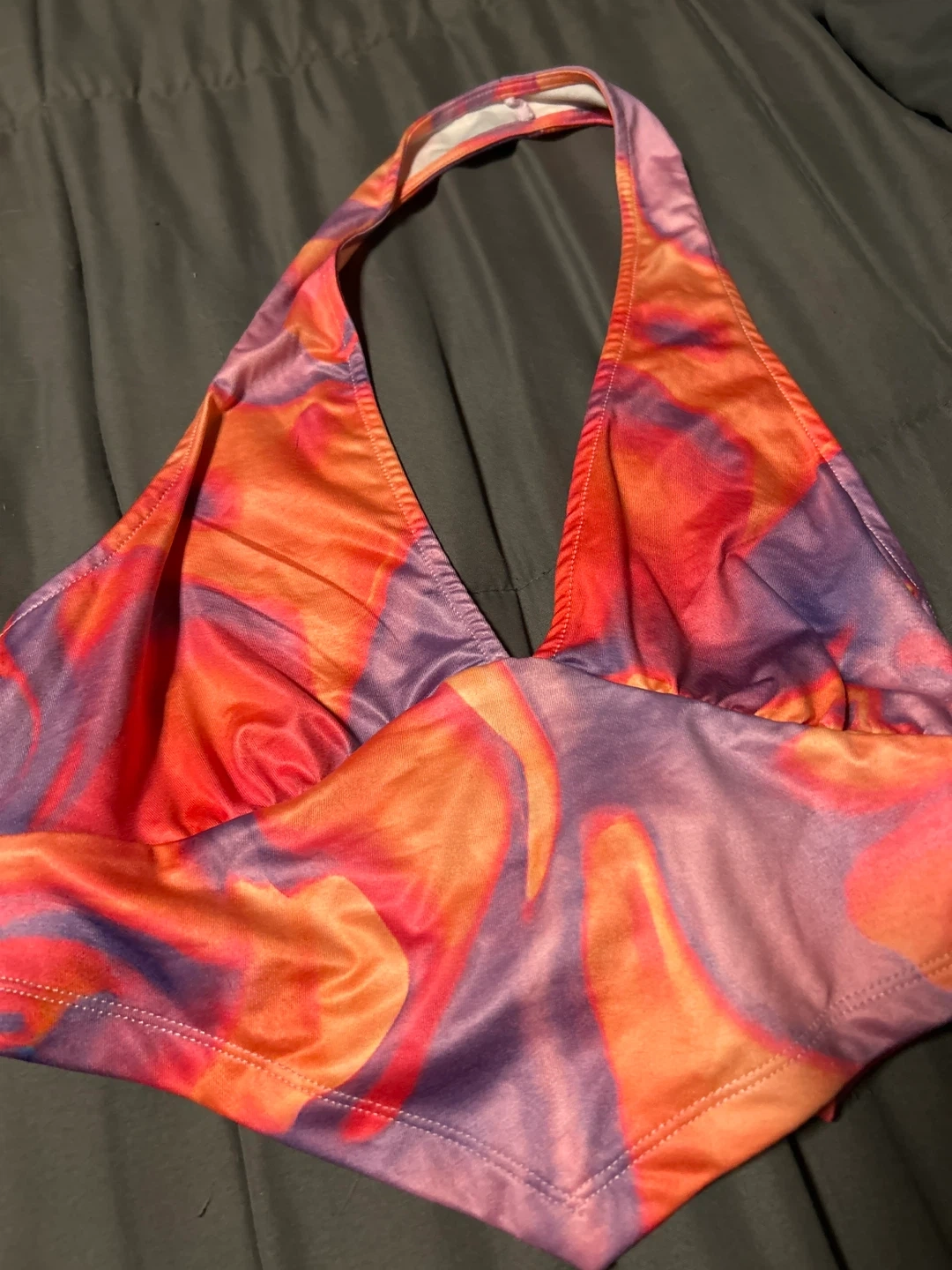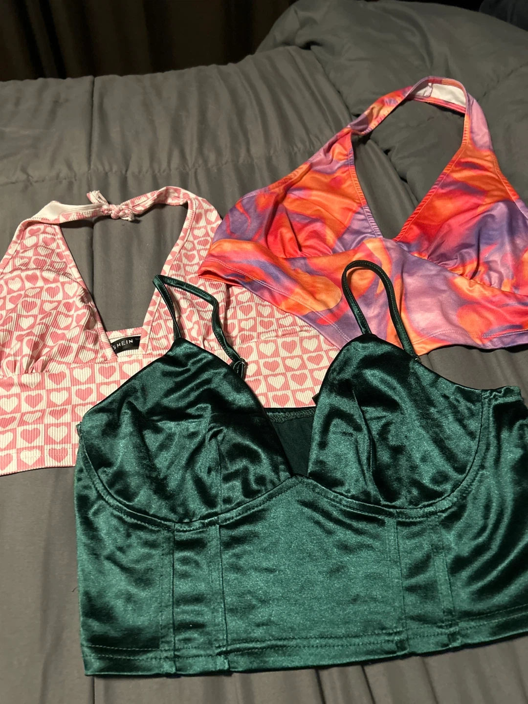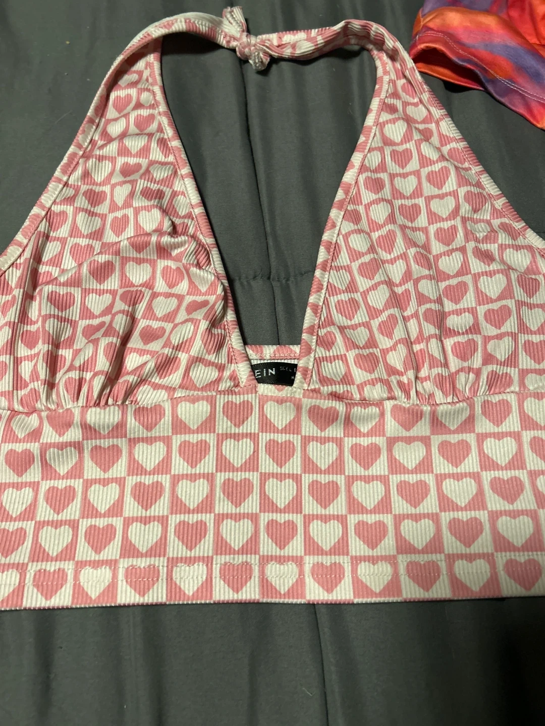 Selling a set of Shein halter tops in size L. The set includes a pink and white heart print top, a green satin top, and a colourful abstract print top