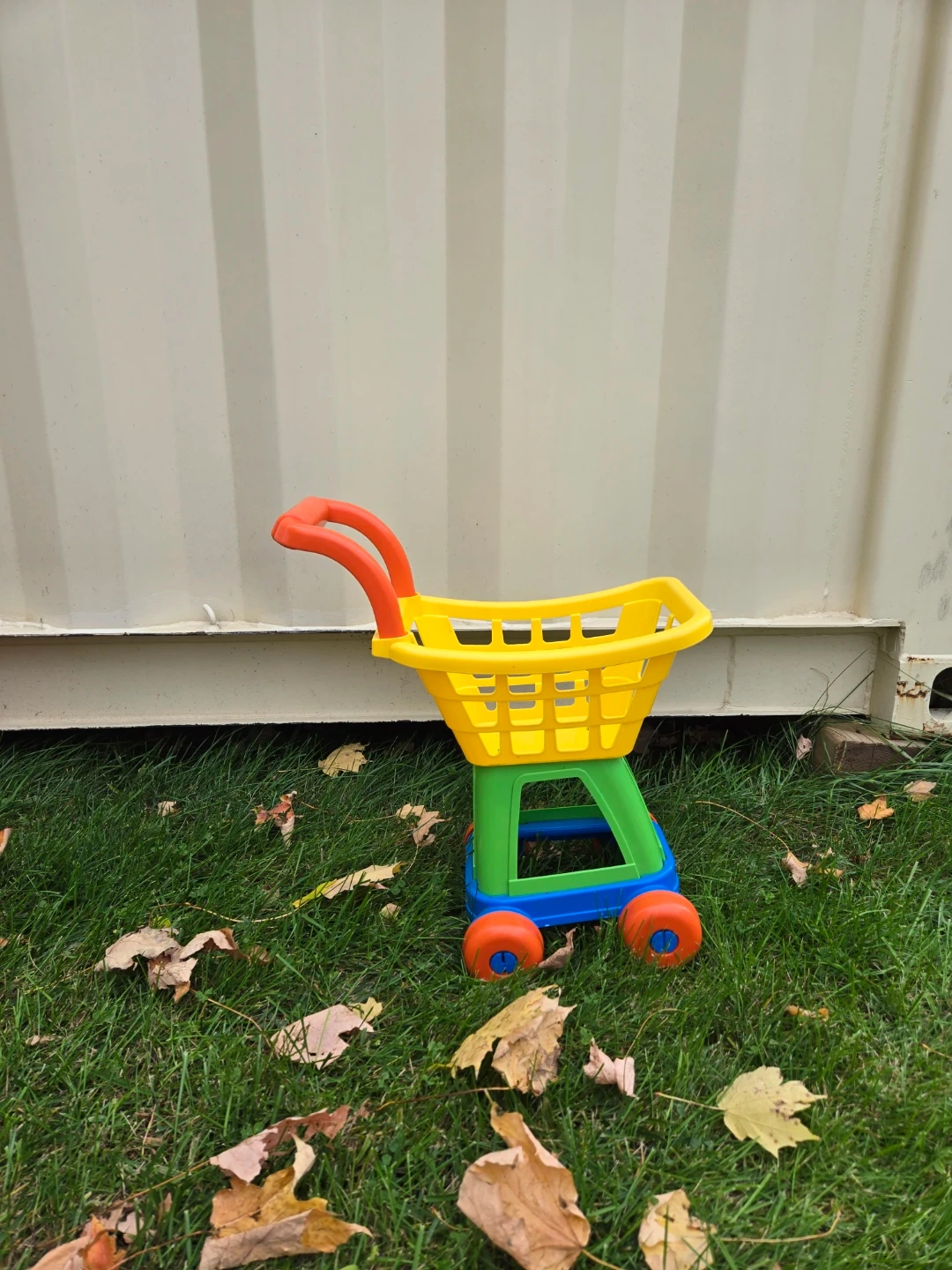 Selling a cute and colourful toy shopping cart for kids! It's in great condition and perfect for pretend play. The cart features a yellow basket, orange handle, green body, and blue wheels.