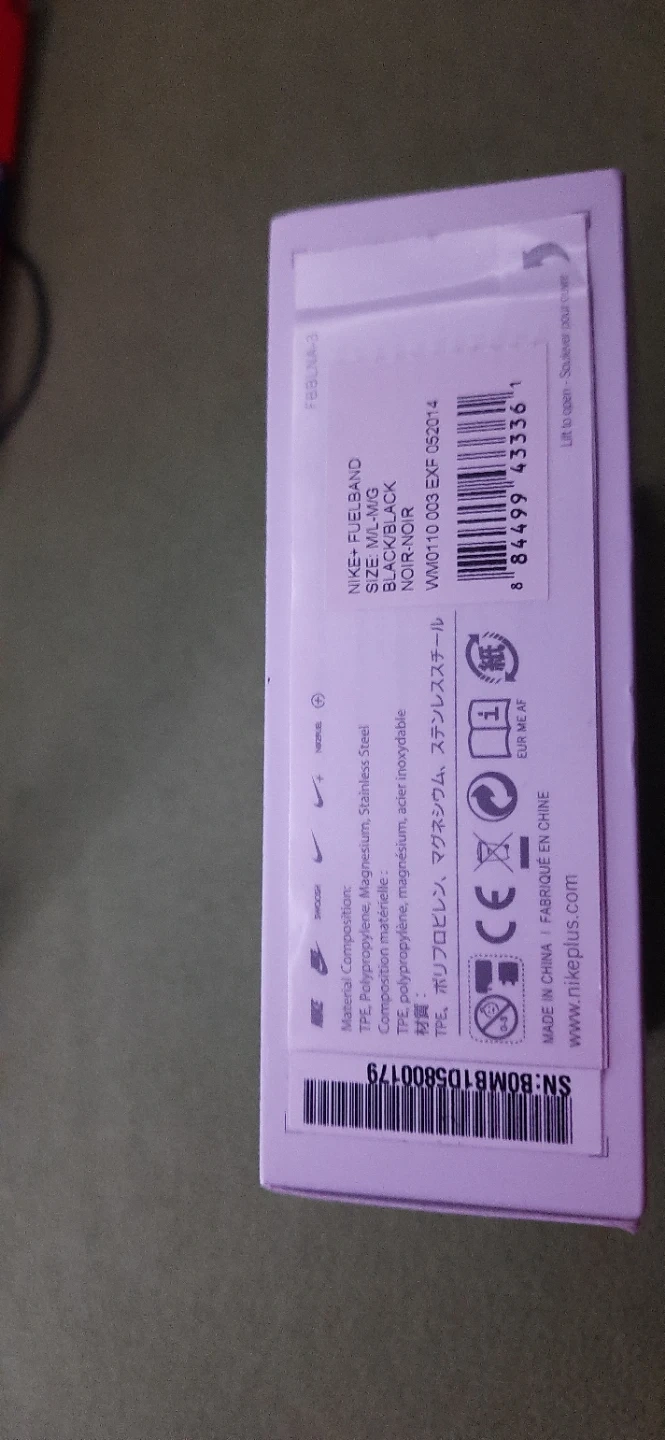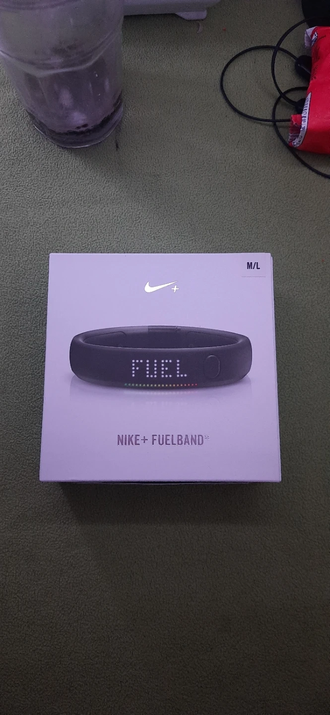 Selling a Nike+ FuelBand in black, size M/L! The band is made of TPE, polypropylene, magnesium, and stainless steel. It comes with the original unopened box