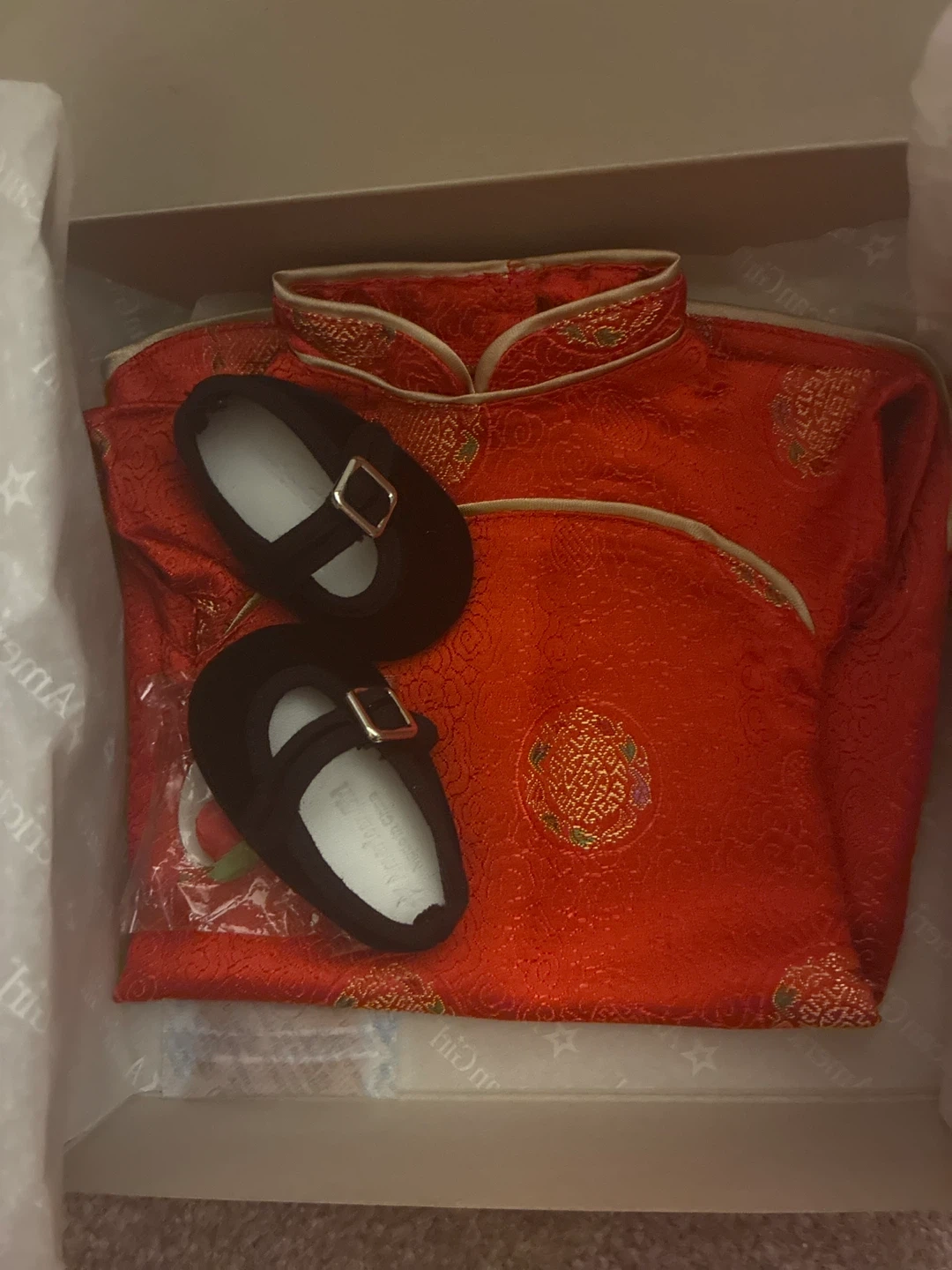 Selling a brand new American Girl Ivy's New Year Outfit! This set comes in its original box, ready for a new home. The outfit features a beautiful red dress with gold detailing and matching black shoes. Perfect for any American Girl doll collector or enthusiast!