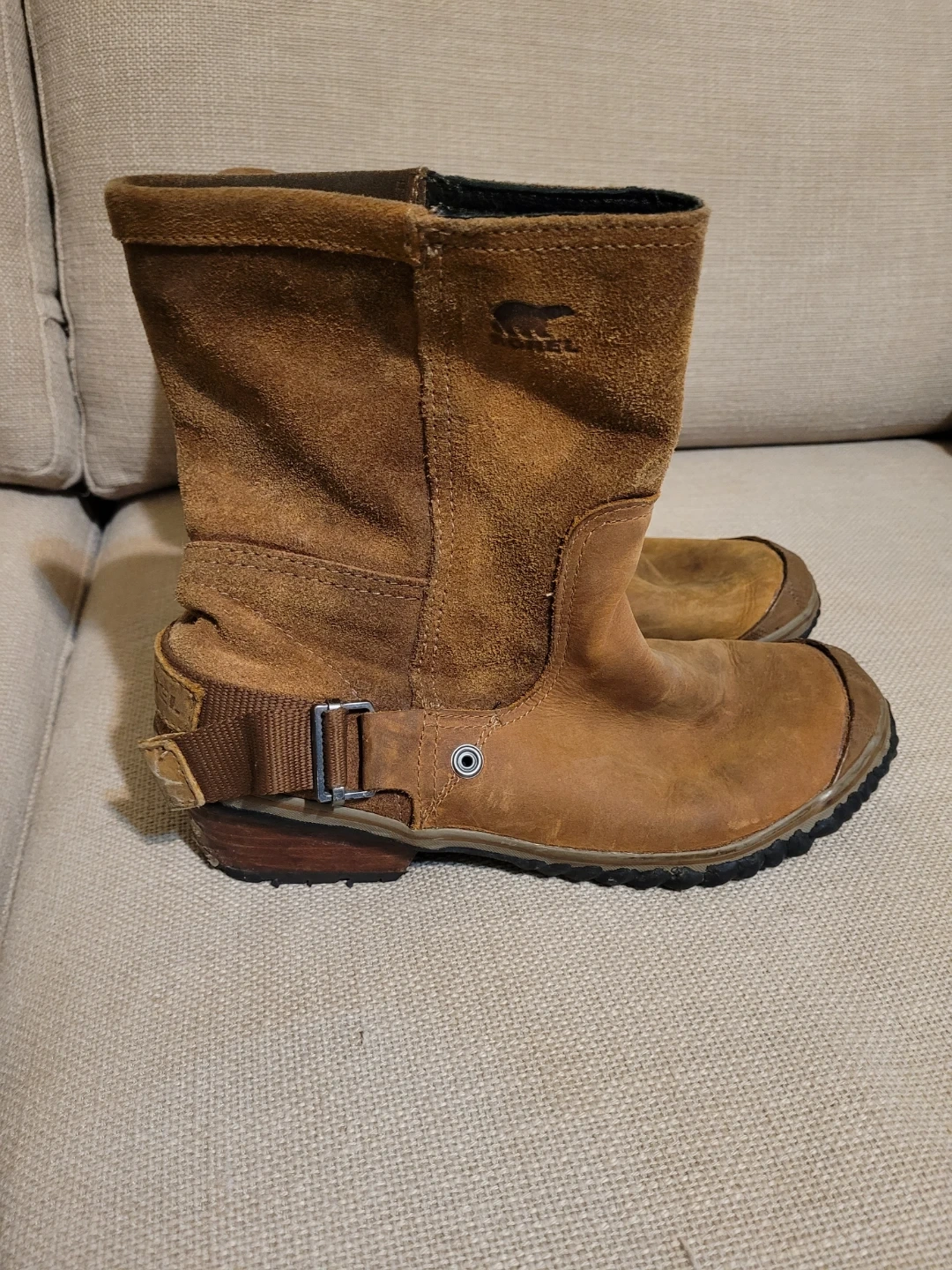 These are a pair of brown leather boots from Sorel! They have a nice rugged look and are ready for anything.