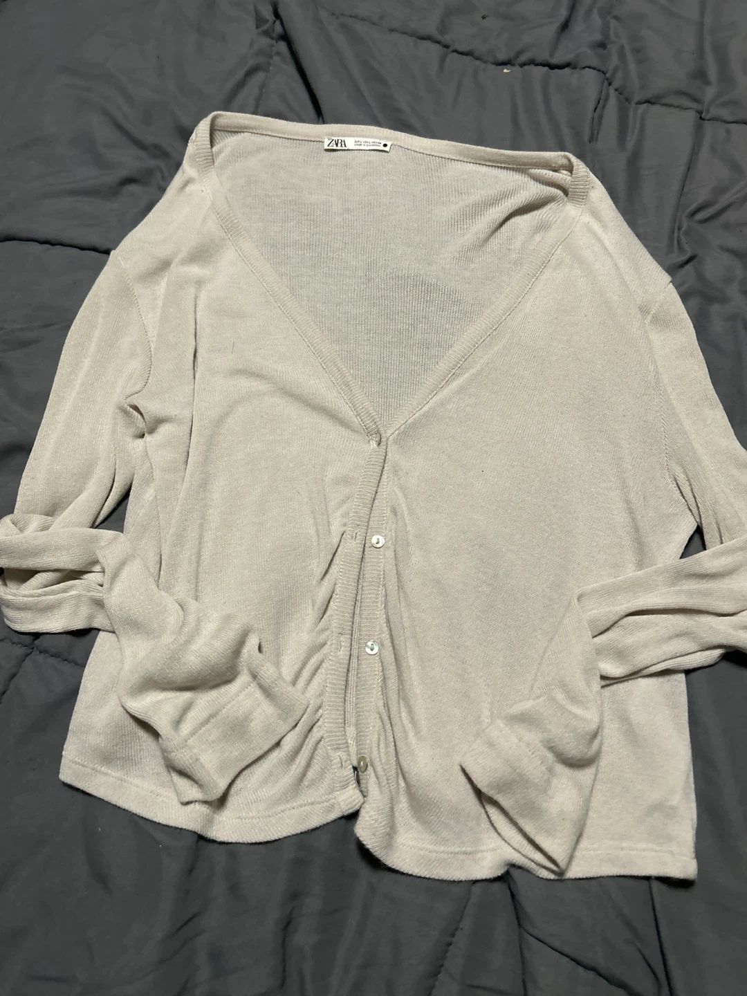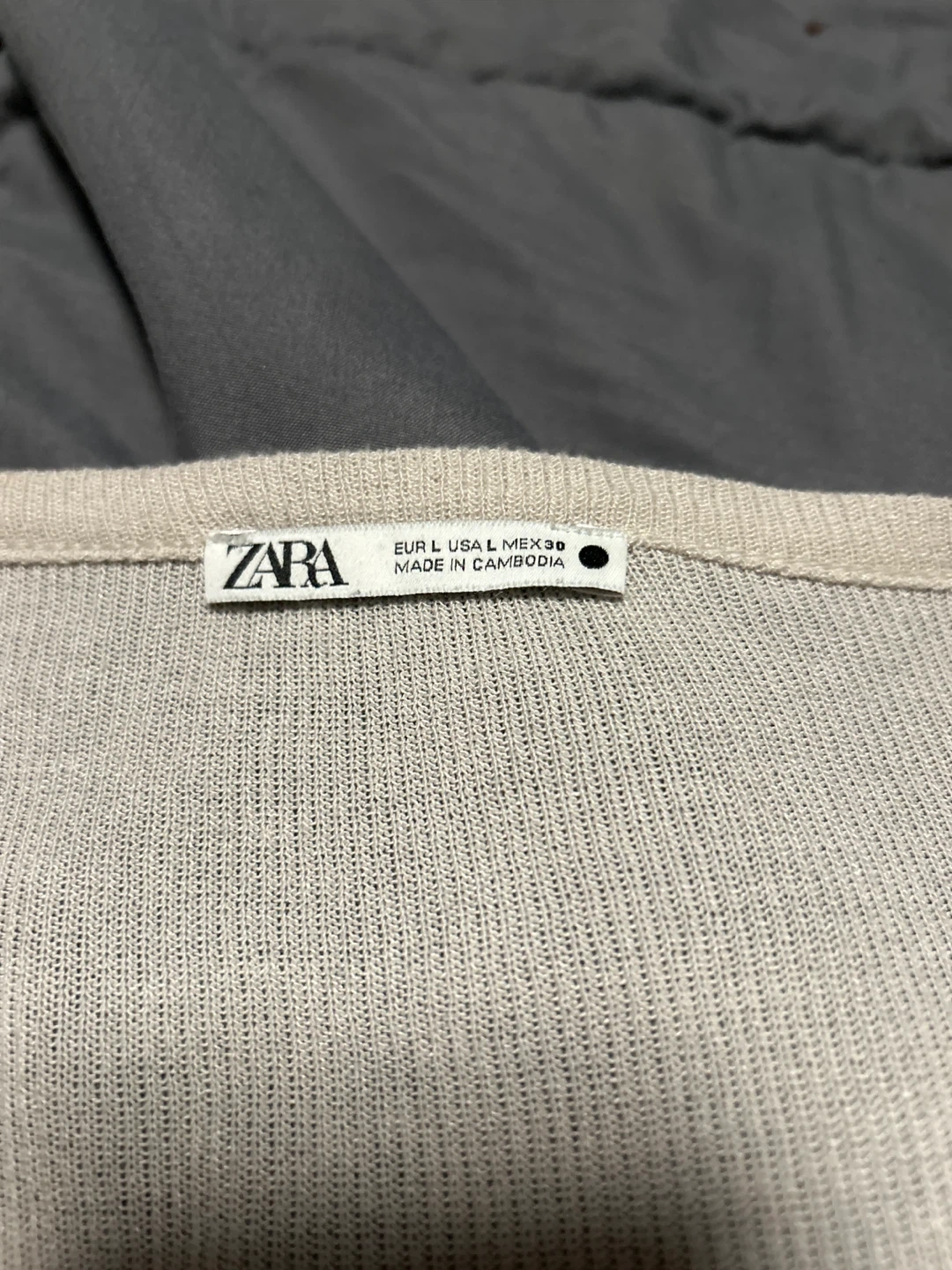 Selling a Zara beige cardigan in size L. It's in great condition and perfect for layering! Made in Cambodia.