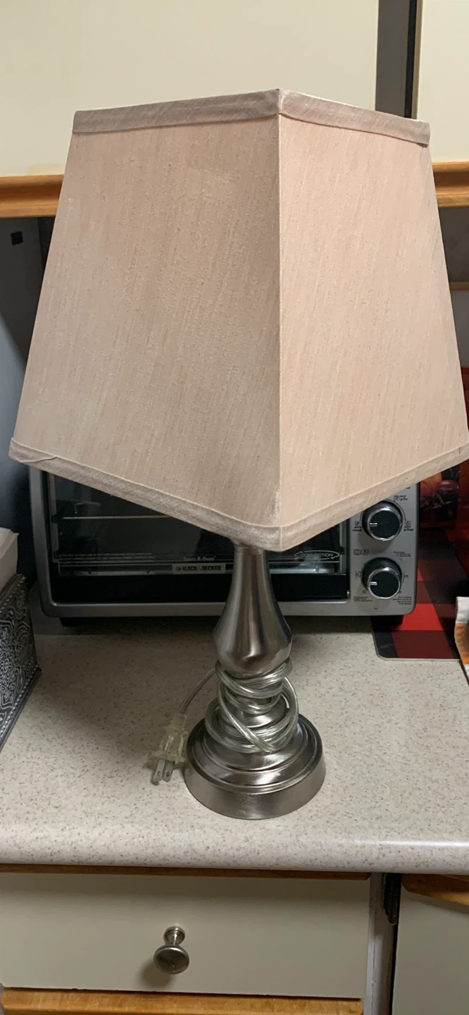 Selling a table lamp with a square, light beige shade. The base is a shiny silver colour with a decorative, winding design. It's in good condition and would look great in any room!